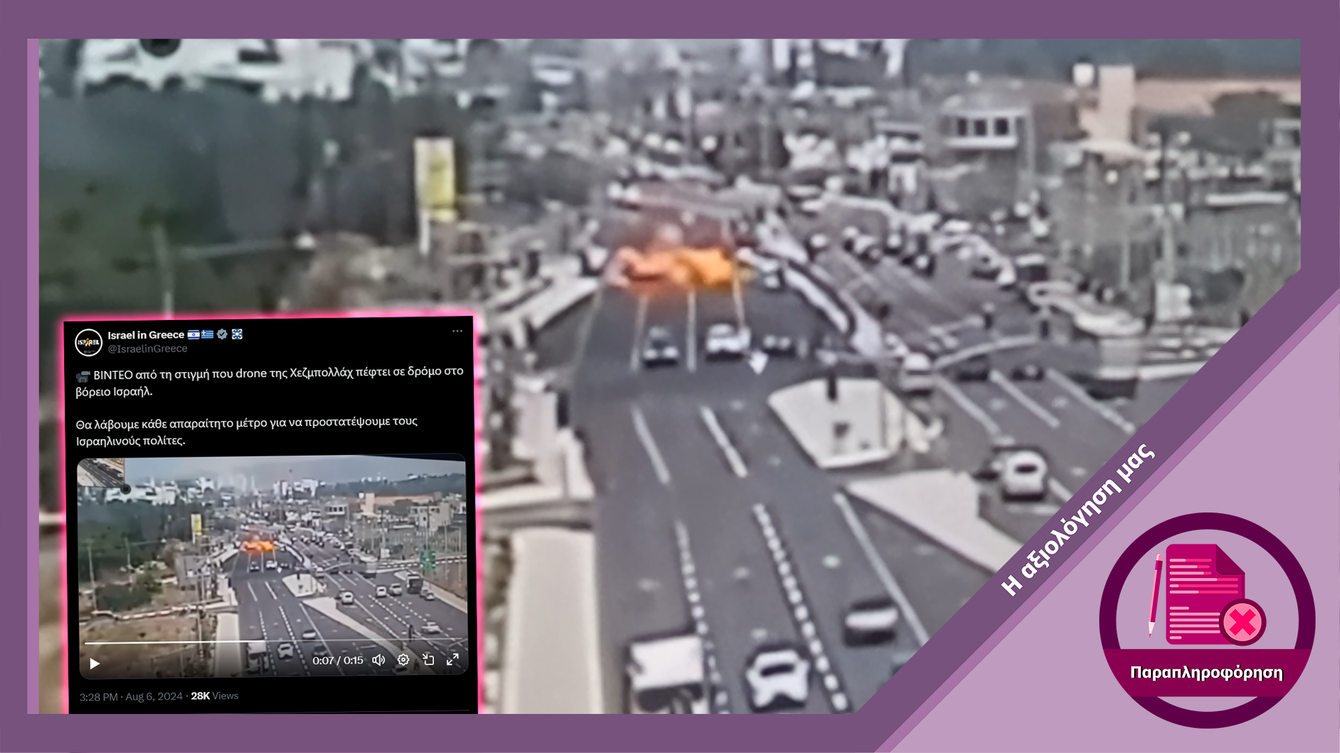 Ο ισχυρισμός του λογαριασμού της Πρεσβείας του Ισραήλ στην Ελλάδα ότι το βίντεο που ανήρτησαν δείχνει πρόσκρουση από drone της Χεζμπολάχ είναι ψευδής. Ενώ εκείνη την ημέρα σημειώθηκαν μαζικές επιθέσεις από σμήνος drone της Χεζμπολάχ τα οποία στόχευσαν στρατιωτικούς στόχους, αλλά χτύπησαν και σημεία εντός της πόλης Nahariya, το επίμαχο βίντεο δεν δείχνει επίθεση από ένα εξ αυτών των drone. Το βίντεο δείχνει πρόσκρουση πυραύλου αναχαίτισης του Ισραήλ από το αντιπυραυλικό σύστημα Iron Dome ο οποίος έχασε τον στόχο του, οδηγώντας στον σοβαρό τραυματισμό τουλάχιστον ενός ανθρώπου.