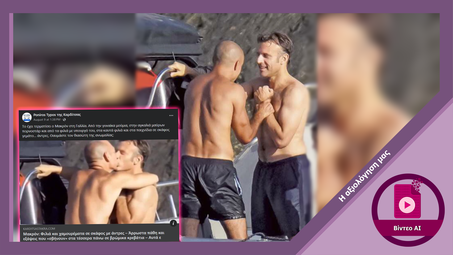 Ο ισχυρισμός ότι βίντεο στα social media δείχνει τον Εμανουέλ Μακρόν να φιλάει τον σωματοφύλακα του στο στόμα είναι ψευδής. Το βίντεο προέκυψε από επεξεργασία φωτογραφίας που έβγαλε το περιοδικό Voici από τις διακοπές του Γάλλου προέδρου με χρήση λογισμικού τεχνητής νοημοσύνης. Τέτοιου είδους λογισμικά μπορούν να χρησιμοποιήσουν ως βάση απλές φωτογραφίες και να τις μετατρέψουν σε βίντεο επεκτείνοντας μάλιστα την κίνηση των εικονιζόμενων για μερικά δευτερόλεπτα. Εξετάζοντας προσεκτικά τα καρέ του βίντεο βλέπουμε ότι η παλάμη του σωματοφύλακα παραμένει στον καρπό του Μακρόν ενώ το υπόλοιπο χέρι του μετακινείται χωρίς την παλάμη, γεγονός που αποδεικνύει ότι δεν πρόκειται για πραγματικό βίντεο.