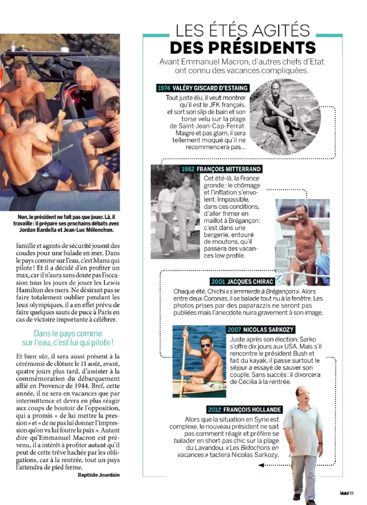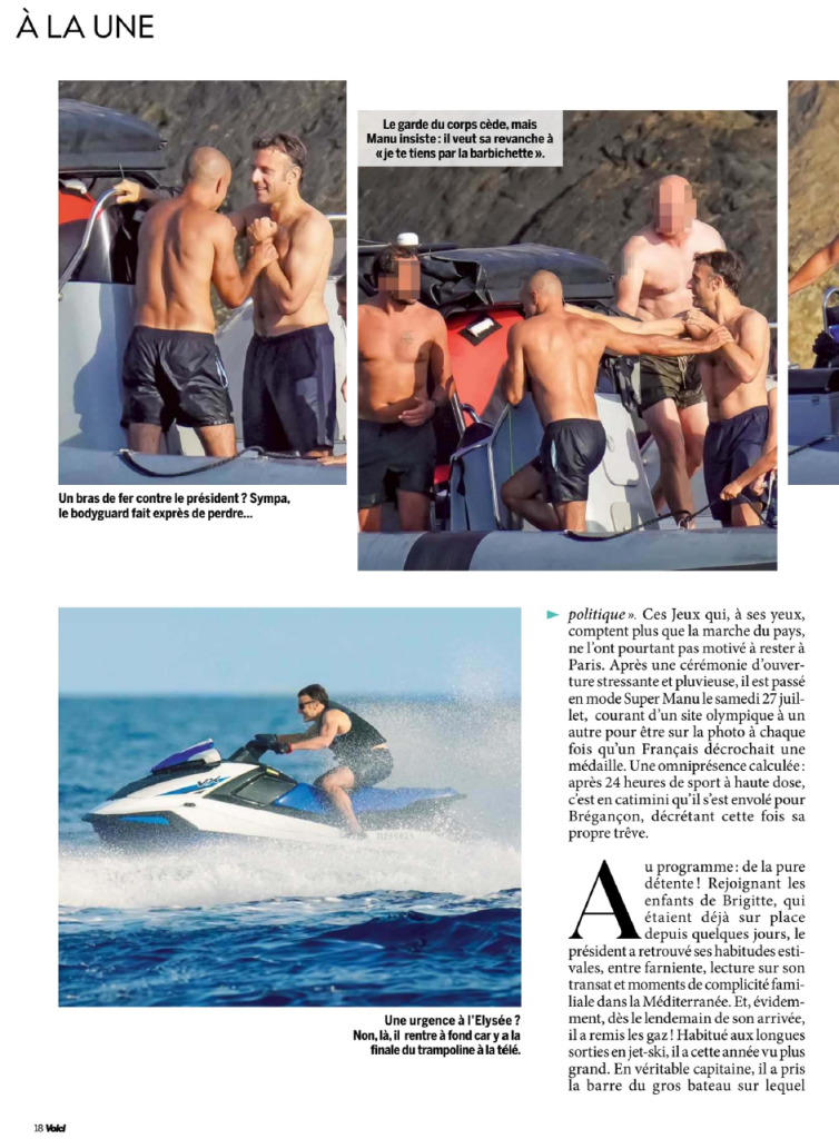 Οι εξεταζόμενες αναρτήσεις περιλαμβάνουν σειρά φωτογραφιών από τις διακοπές του Γάλλου προέδρου στις αρχές Αυγούστου. Τις φωτογραφίες δημοσίευσε το περιοδικό Voici στο τεύχος για τις 2 Αυγούστου του 2024.