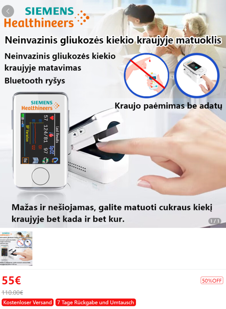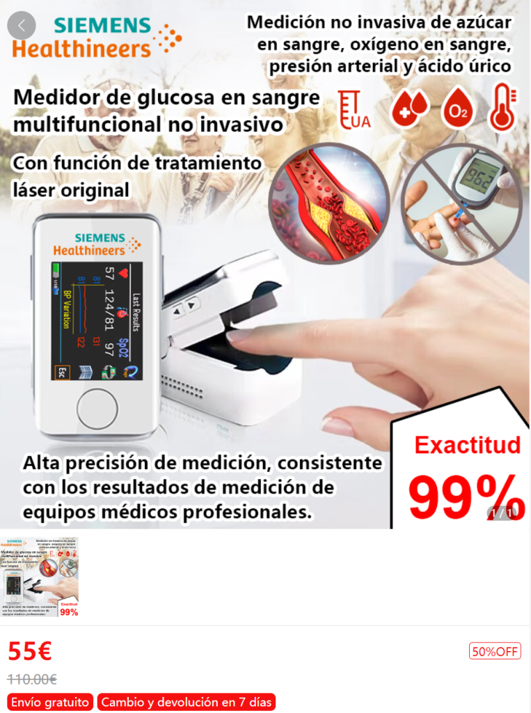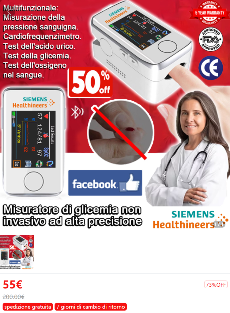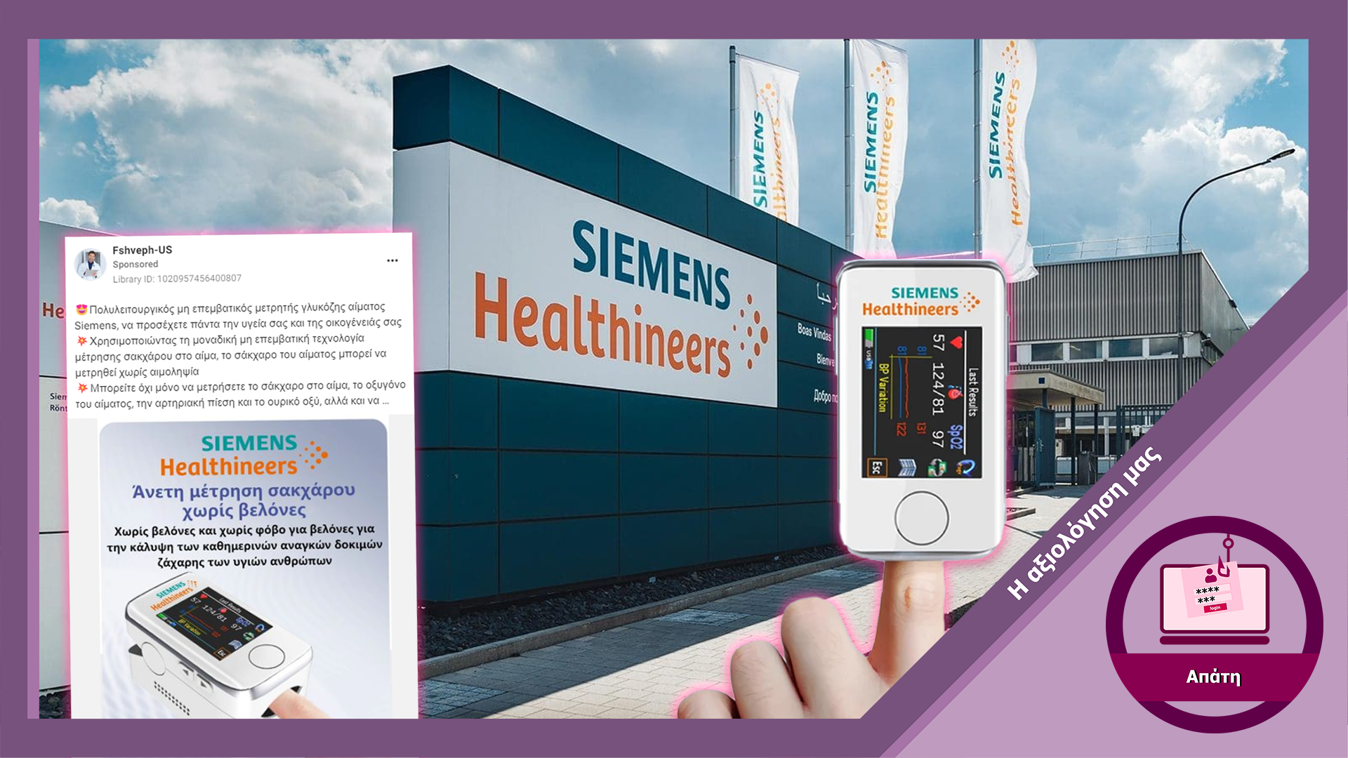 Στο Facebook κυκλοφορούν προωθούμενες διαφημίσεις για υποτιθέμενη ιατρική συσκευή μέτρησης σακχάρου. Η εν λόγω συσκευή παρουσιάζεται ως προϊόν της Siemens Healthineers το οποίο μάλιστα έχει πάρει έγκριση από τον οργανισμό τροφίμων και φαρμάκων των ΗΠΑ (FDA). Ωστόσο πρόκειται για περίπτωση απάτης η οποία χρησιμοποιεί παράνομα το όνομα της εν λόγω εταιρίας, καθώς το προϊόν δεν σχετίζεται με την Siemens.