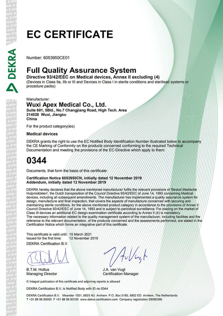 Όπως βλέπουμε στην εικόνα το πιστοποιητικό αφορά την εταιρία Wuxi Apex Medical Co., Ltd επομένως αναζητήσαμε την σελίδα της εταιρίας και βρήκαμε τα 3 έγγραφαΜπορείτε να βρείτε τα έγγραφα από την σελίδα της Wuxi Apex Medical αρχειοθετημένα εδώ, εδώ και εδώ. σε υψηλή ανάλυση: