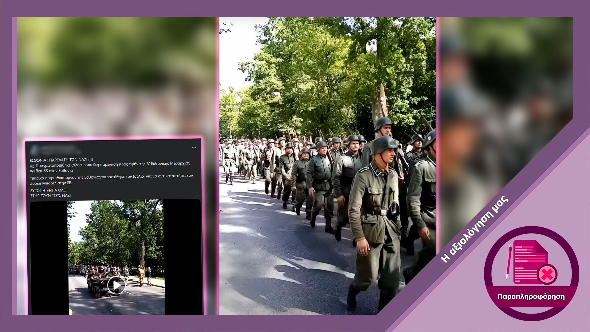 Αναρτήσεις στα μέσα κοινωνικής δικτύωσης αναπαράγουν βίντεο που υποτίθεται πως δείχνει στρατιώτες με στολές της ναζιστικής Γερμανίας να παρελαύνουν σε δρόμο της Εσθονίας, και το βίντεο συνοδεύεται από ισχυρισμούς περί φιλοναζιστικών εκδηλώσεων. Ωστόσο ο ισχυρισμός είναι ψευδής καθώς δεν πρόκειται για εκδήλωση υπερ της ναζιστικής Γερμανίας αλλά για φεστιβάλ το οποίο περιλαμβάνει, μεταξύ άλλων, και αναπαραστάσεις ιστορικών μαχών.
