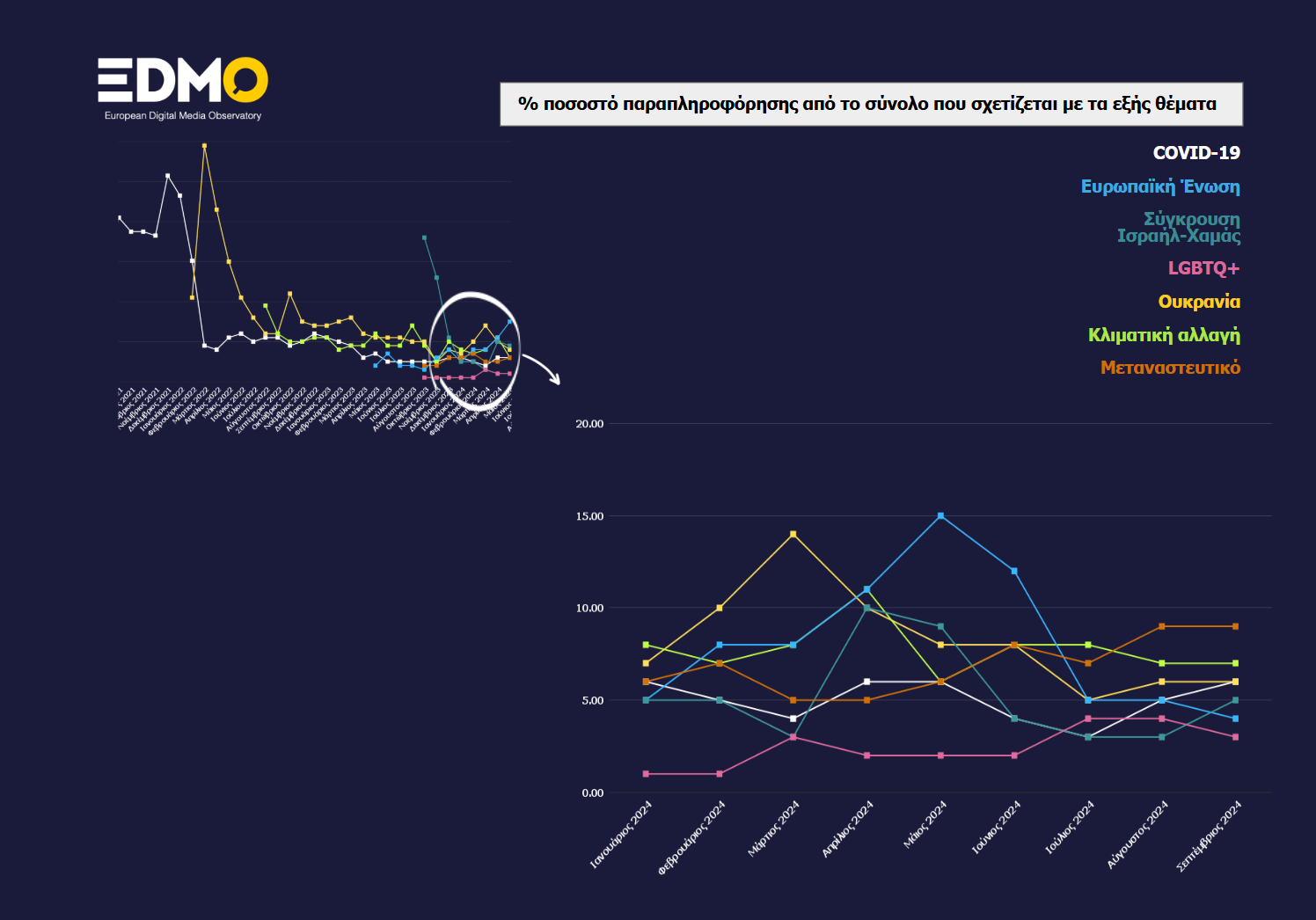 Η κακόβουλη παραπληροφόρηση σχετικά με θέματα μετανάστευσης παρέμεινε σταθερή και σχετικά υψηλή μέσα στον Σεπτέμβριο μετά από σημαντική αύξηση τους προηγούμενους μήνες. Τα ποσοστά ψευδών ισχυρισμών τόσο για την κρίση στην Μέση Ανατολή όσο και για την COVID-19 σημείωσαν μικρή αύξηση, συγκριτικά με το καλοκαίρι όταν σημείωσαν τα μικρότερα καταγεγραμμένα τους ποσοστά. Τα ποσοστά για τα υπόλοιπα θέματα παραπληροφόρησης που παρακολουθούνται, παρέμειναν σταθερά ή σημειώσαν μικρή μείωση, όπως στην περίπτωση της κακόβουλης παραπληροφόρησης που αφορά την ΕΕ και την κοινότητα ΛΟΑΤΚΙ+. Η κακόβουλη παραπληροφόρησης που αφορούσε τις αμερικανικές προεδρικές εκλογές, η οποία είναι νέο θέμα στην λίστα παρακολούθησης του δικτύου ελέγχου γεγονότων του EDMO, σημείωσε τα μεγαλύτερα ποσοστά αναπαραγωγής αβάσιμων ισχυρισμών.