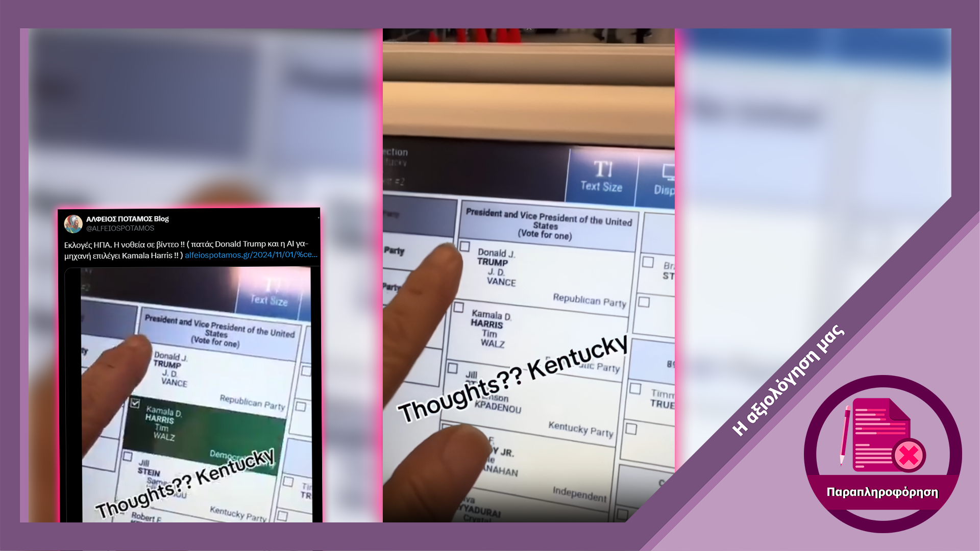 Σε μέσα ενημέρωσης και λογαριασμούς στα μέσα κοινωνικής δικτύωσης αναπαράγεται ο ισχυρισμός ότι, σύμφωνα με βίντεο που τράβηξε ψηφοφόρος στο Κεντάκι των ΗΠΑ, τα εκλογικά μηχανήματα της πολιτείας άλλαζαν αυτόματα τις ψήφους από τον Ντόναλντ Τραμπ στην Κάμαλα Χάρις. Ωστόσο ο εν λόγω ισχυρισμός είναι ψευδής.
