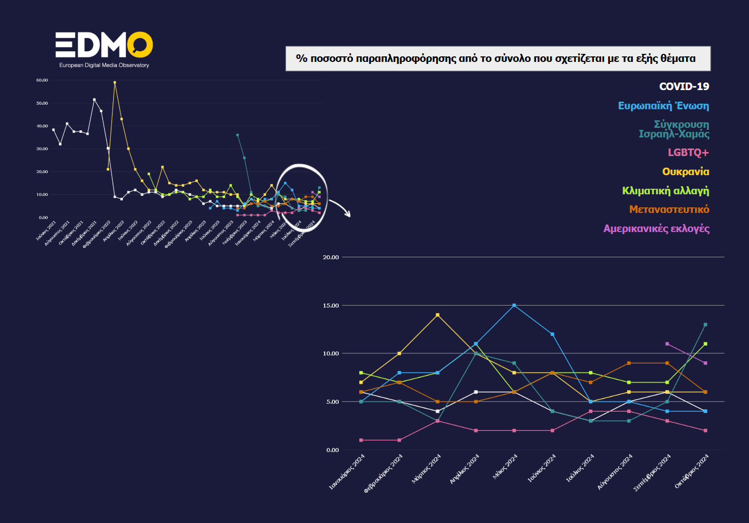 Ο πόλεμος στην Μέση Ανατολή αποτέλεσε ένα από τα θέματα με τα περισσότερα αφηγήματα κακόβουλης παραπληροφόρησης τον Οκτώβριο. Το ποσοστό κακόβουλης παραπληροφόρησης που αφορούσε αυτό το θέμα διπλασιάστηκε συγκριτικά με τον περασμένο μήνα, καθώς βρίσκονταν στο 5% τον Σεπτέμβριο. Τα ψευδή αφηγήματα σχετικά με την κλιματική αλλαγή αυξήθηκαν επίσης αισθητά, από το 7% στο 11% μέσα σε ένα μήνα καθώς σημειώθηκε εκμετάλλευση των κλιματικών καταστροφών που παρατηρήθηκαν εντός και εκτός της ΕΕ. Το ποσοστό κακόβουλης παραπληροφόρησης σε άλλα θέματα που παρατηρούνται από το EDMO παρέμεινε σταθερό ή μειώθηκε, όπως στην περίπτωση των αβάσιμων ισχυρισμών περί μετανάστευσης, της COVID-19 και των ζητημάτων που αφορούν την ΛΟΑΤΚΙ+ κοινότητα και έμφυλα ζητήματα.