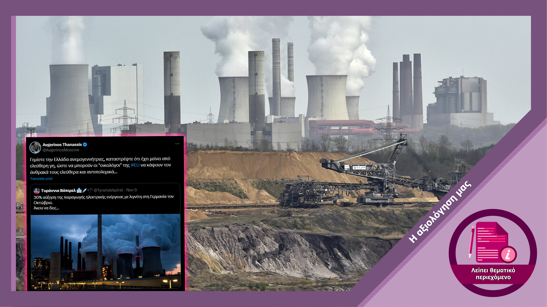 Λογαριασμοί στα μέσα κοινωνικής δικτύωσης και μέσα ενημέρωσης αναπαράγουν τον ισχυρισμό ότι η Γερμανία αύξησε την παραγωγή ηλεκτρικής ενέργειας από λιγνίτη κατά 30% μέσα στον Οκτώβριο του 2024. Ο ισχυρισμός συνοδεύεται από κριτική σε χώρες όπως η Ελλάδα που αυξάνουν το ποσοστό παραγωγής ενέργειας με χρήση εναλλακτικών πηγών, αναφέροντας ότι ενώ γίνεται αυτή η προσπάθεια ενεργειακής μετάβασης, χώρες του βορρά όπως η Γερμανία εκμεταλλεύονται ορυκτά καύσιμα ενισχύοντας την οικονομία τους. Ωστόσο ο ισχυρισμός είναι ψευδής, καθώς τα δεδομένα δείχνουν σταδιακή μείωση της χρήσης ορυκτών καυσίμων, και συγκεκριμένα λιγνίτη, στην Γερμανία τα τελευταία 20 χρόνια.