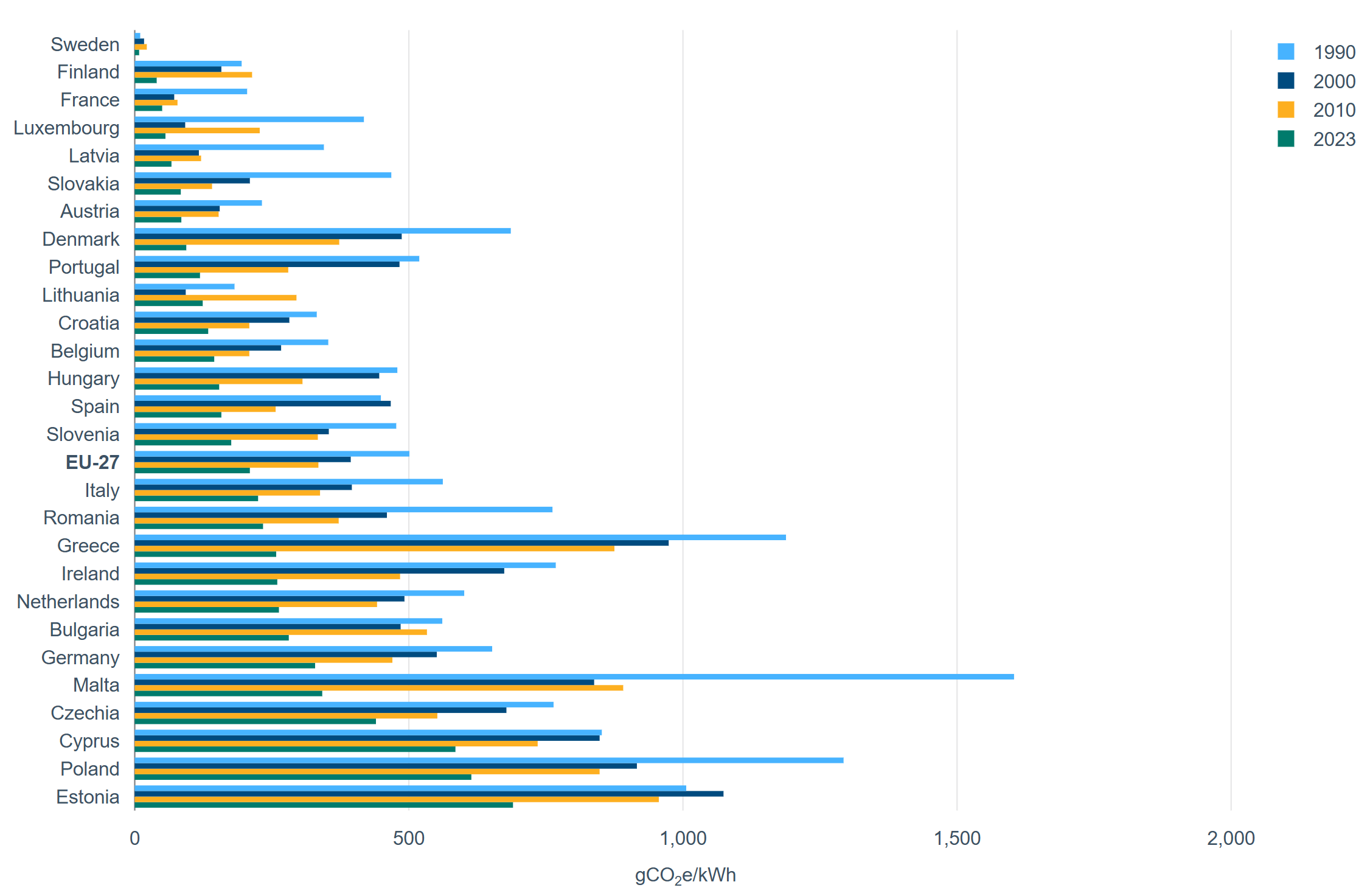 Εκπομπές διοξειδίου του άνθρακα (γραμμάρια ισοδύναμου διοξειδίου του άνθρακα) ανά κιλοβατώρα στις χώρες της ΕΕ το 1990, το 2000, το 2010 και το 2023.