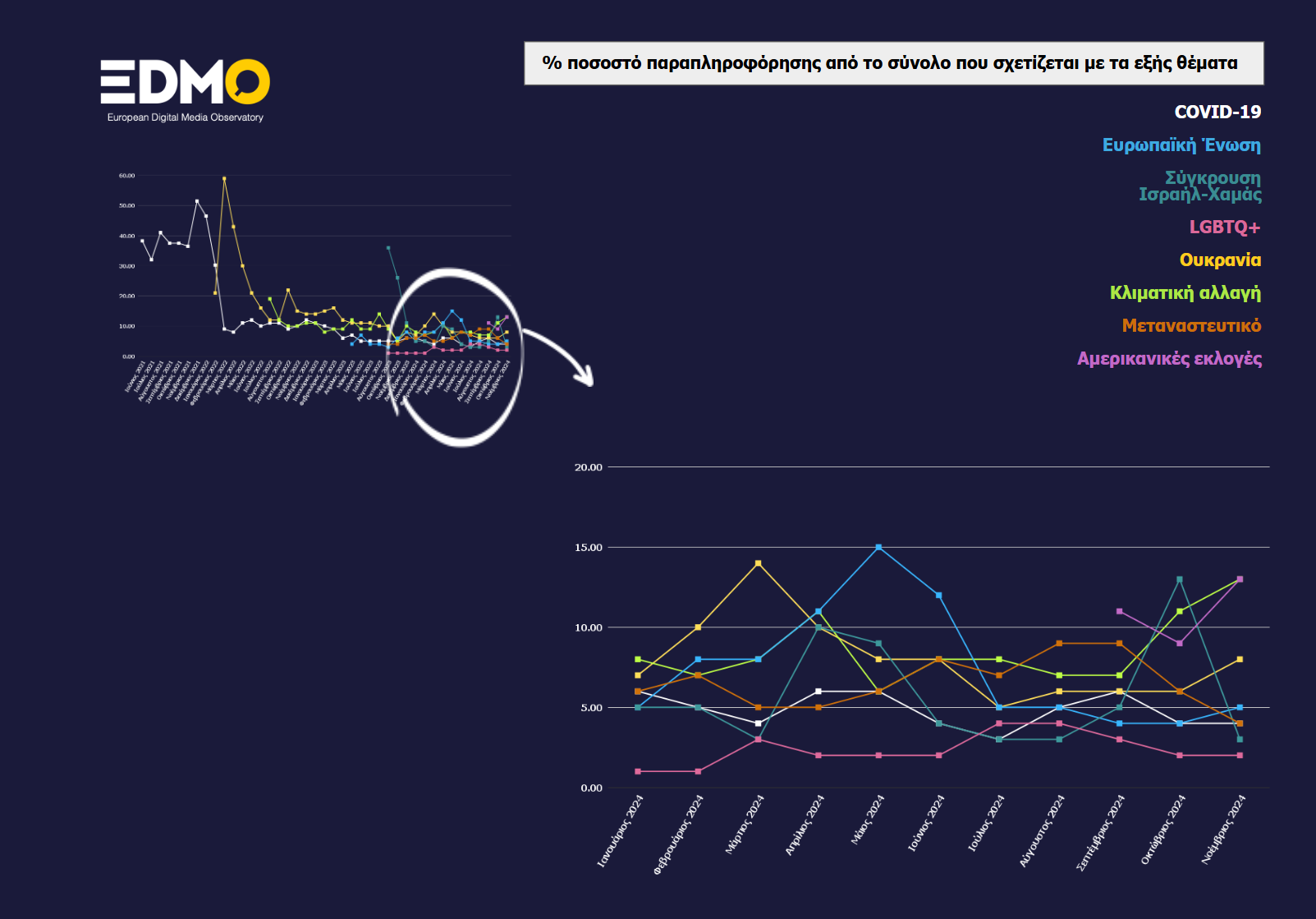 Η παραπληροφόρηση για τον πόλεμο στη Μέση Ανατολή, που ήταν ένα από τα βασικά θέματα στα οποία εστίασαν αφηγήματα κακόβουλης παραπληροφόρησης τον Οκτώβριο, μειώθηκε στο 3% από το 13% τον Οκτώβριο. Το ποσοστό κακόβουλης παραπληροφόρησης σε άλλα θέματα που παρατηρούνται από το EDMO παρέμεινε σταθερό ή μειώθηκε, όπως στην περίπτωση των αβάσιμων ισχυρισμών περί μετανάστευσης, της COVID-19 και των ζητημάτων που αφορούν την ΛΟΑΤΚΙ+ κοινότητα και έμφυλα ζητήματα.