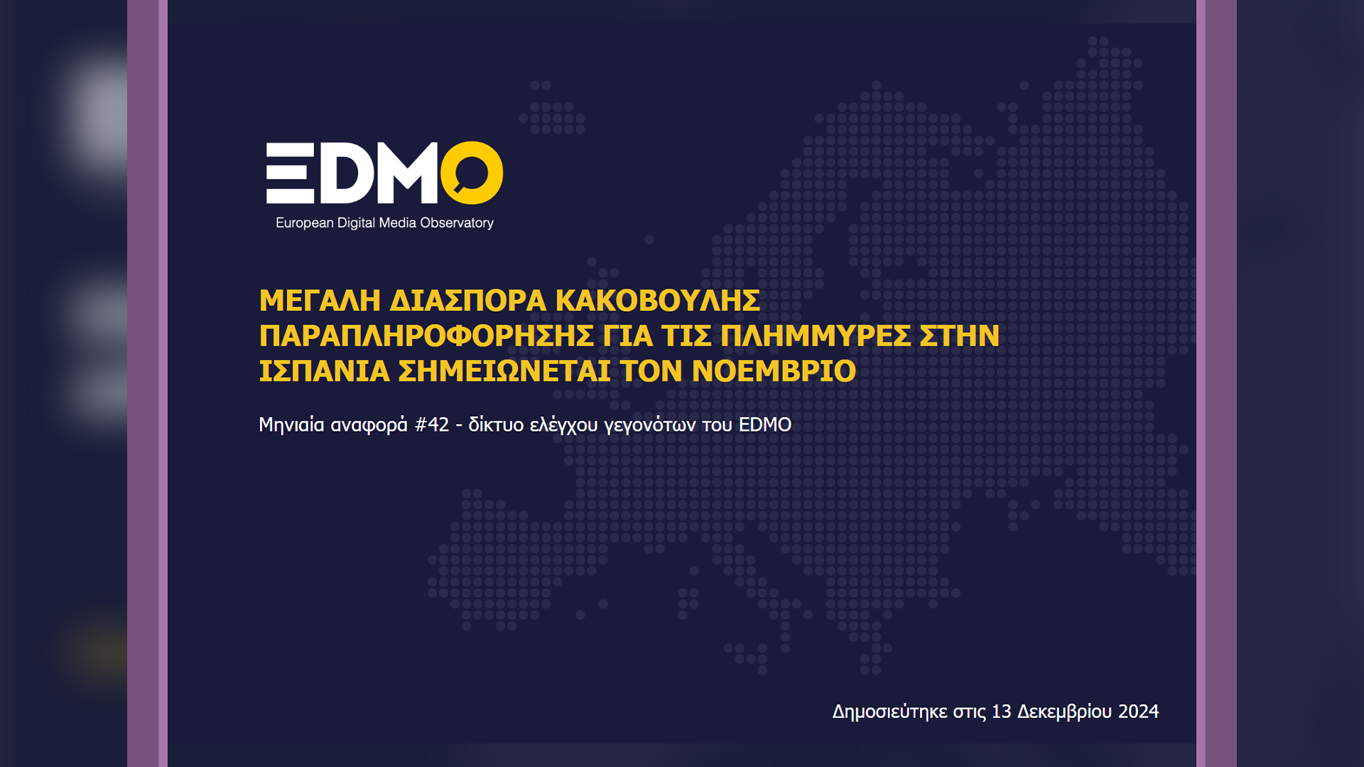 Τα αφηγήματα κακόβουλης παραπληροφόρησης σχετικά με τις καταστροφικές ξαφνικές πλημμύρες που έπληξαν τη νότια Ισπανία στα τέλη Οκτωβρίου, τα οποία κυκλοφορούσαν και τον προηγούμενο μήνα και εξετάστηκαν στην προηγούμενη αναφορά, συνεχίζουν να κυκλοφορούν και να αυξάνουν τον αντίκτυπο τους σε όλη την ΕΕ. Συγκεκριμένα, μέλη του δικτύου fact-checking του EDMO στις περισσότερες χώρες της ΕΕ, εντόπισαν ψευδείς ισχυρισμούς οι υποστήριζαν ότι η καταιγίδα δημιουργήθηκε από ανθρώπινες παρεμβάσεις μέσω υποτιθέμενων γεωμηχανικών τεχνικών ή προκαλούνταν σκόπιμα με την καταστροφή των φραγμάτων στην περιοχή της Βαλένθια.