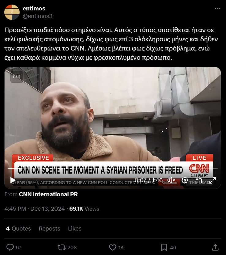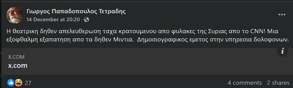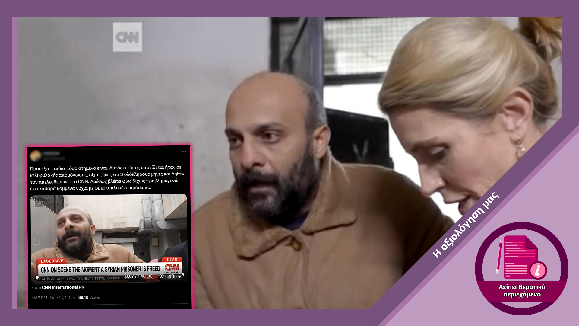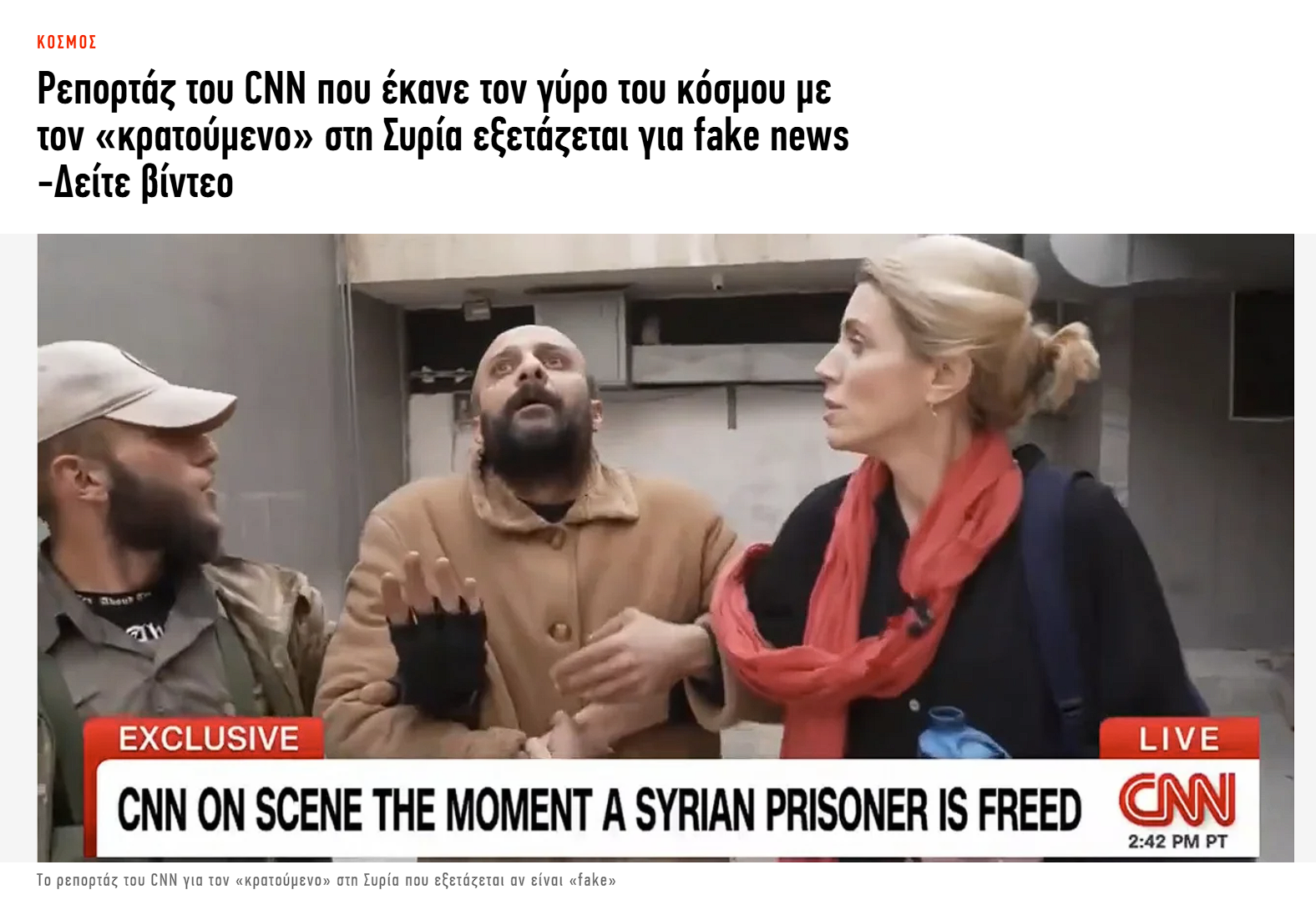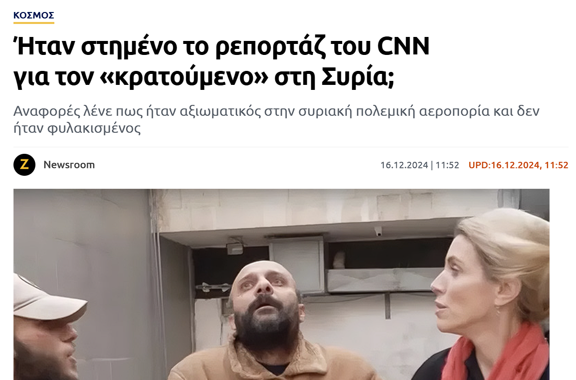 Διεθνείς τίτλους έκανε ρεπορτάζ του CNN, το οποίο φαινόταν να απεικονίζει την απελευθέρωση ενός κρατουμένου από φυλακές της Συρίας, έπειτα από την πτώση του καθεστώτος του Μπασάρ αλ Άσαντ. Ενώ ο κρατούμενος ισχυρίστηκε ότι αποτέλουσε αθώο θύμα του καθεστώτος, σύντομα έγιναν viral αναφορές που χαρακτήριζαν το όλο συμβάν “στημένο”. Πολλοί σχολιαστές επίσης, απέδωσαν την ευθύνη στο ίδιο το CNN.