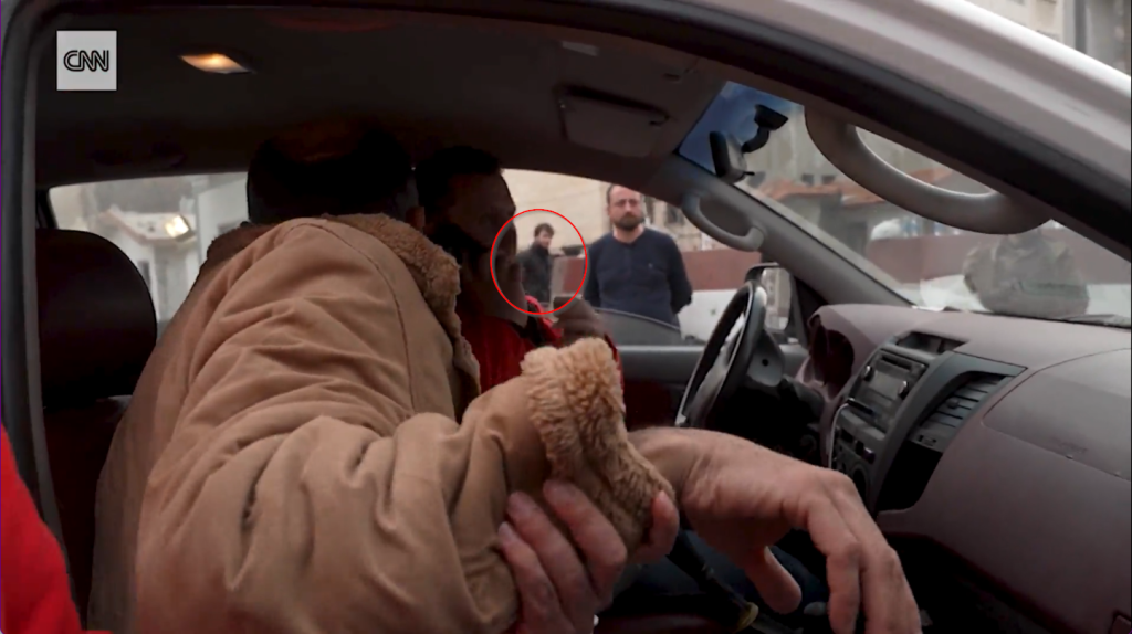Τέλος, στο πλάνο εμφανίζονται διασώστες της Ερυθράς ΗμισέληνουΠρόκειται για το αντίστοιχο του Ερυθρού Σταυρού στον μουσουλμανικό κόσμο, που βάζουν τον άνδρα σε ασθενοφόρο και αναχωρούν. Ο οργανισμός έπειτα δημοσίευσε και στον λογαριασμό του στο X φωτογραφίες από τη μεταφορά του άντρα, και δήλωσε ότι είχε βρει έναν συγγενή του στη Δαμασκό, με τον οποίο ο άνδρας επανενώθηκε.