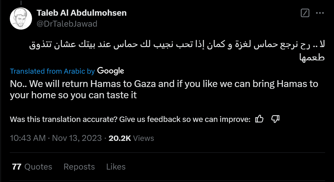 Το βίντεο έπειτα επικαλείται άλλη ανάρτηση του Αλ-Αμπντουλμόχσεν από το 2023, στην οποία ο ίδιος υποτίθεται υποστηρίζει την ισλαμιστική Χαμάς. Στην πραγματικότητα, στην επίμαχη ανάρτηση, ο ίδιος ειρωνεύεται άλλον σχολιαστή, λέγοντας «θα επιστρέψουμε τη Χαμάς στη Γάζα, και αν θέλεις, θα τη φέρουμε και στο σπίτι σου για να το γευτείς».