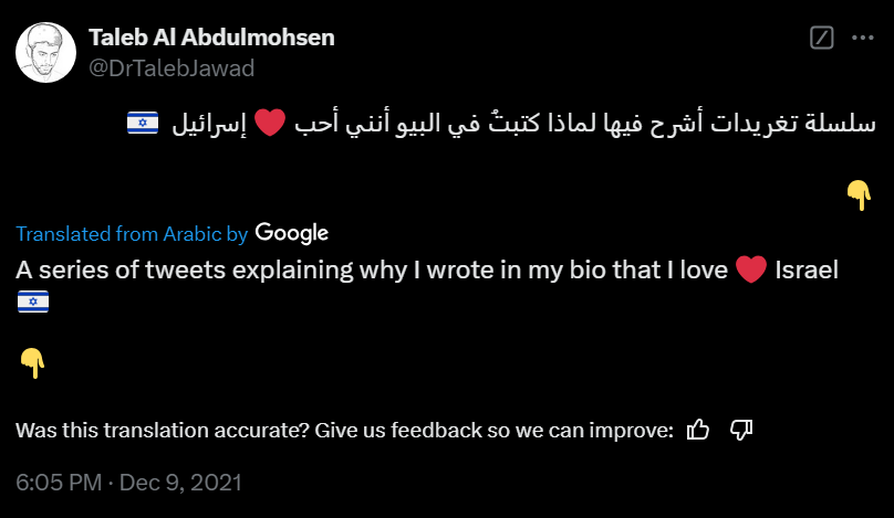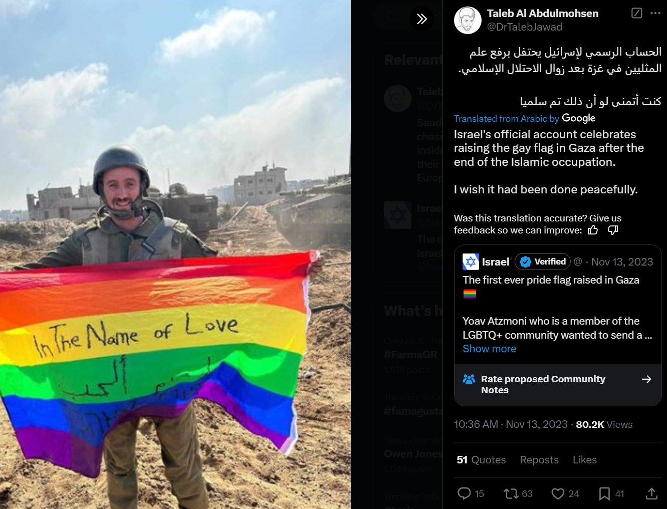 Λίγα λεπτά πριν από εκείνο το σχόλιο, ο Αλ-Αμπντουλμόχσεν είχε κοινοποιήσει χωριστά την ανάρτηση κάτω από την οποία σχολίαζε, στην οποία επικροτούσε την αναφερόμενη υποστήριξη των δικαιωμάτων της ΛΟΑΤΚΙ κοινότητας από τον ισραηλινό στρατόΗ εν λόγω κοινότητα έχει δεχθεί διώξεις στην περιοχή της Γάζας, ενώ το Ισραήλ γενικώς υποστηρίζει ένα πιο συμπεριληπτικό περιβάλλον για την κοινότητα αυτή.: