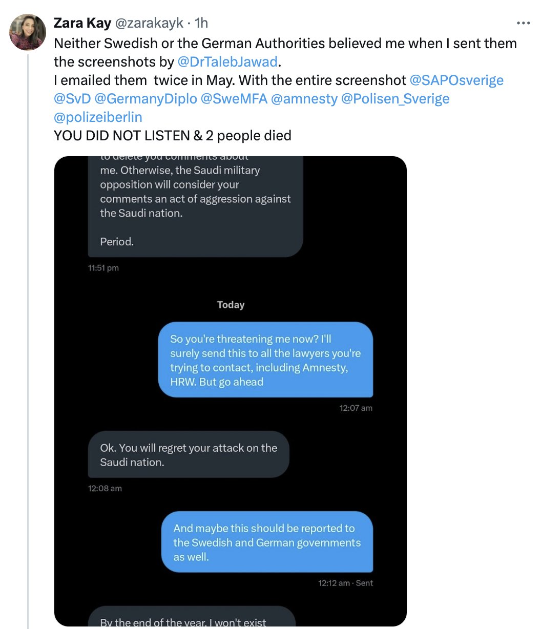 Έπειτα, το βίντεο παραθέτει μια ανάρτηση της πρώην μουσουλμάνας και σχετικής ακτιβίστριας, Zara Kay. Η ανάρτηση φαίνεται να περιλαμβάνει διαδικτυακή συνομιλία της με τον Αλ-Αμπντουλμόχσεν, στην οποία ο ίδιος απαιτεί να διαγραφούν σχόλια της Kay κατά του “Σαουδικού έθνους”, και αυτή απαντάει ότι θα καταγγείλει την απειλή σε αρμόδιους θεσμούς. Στο τέλος της ανάρτησης φαίνεται ότι ο ίδιος δηλώνει ότι «δεν θα υπάρχει μέχρι το τέλος του έτους». Η εν λόγω ανάρτηση πλέον διαγράφηκε από την Kay, αλλά η ίδια έπειτα ανέρτησε πάλι την ίδια εικόνα, με πιο ήπιο τόνο έναντι των αρχών που η ίδια διατείνεται ότι είχε ενημερώσει, και χωρίς την τελευταία φράση του Αλ-Αμπντουλμόχσεν.