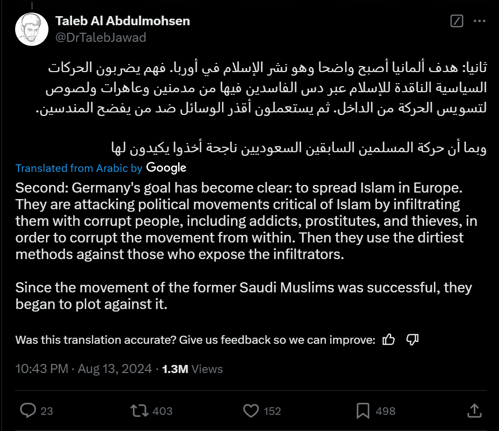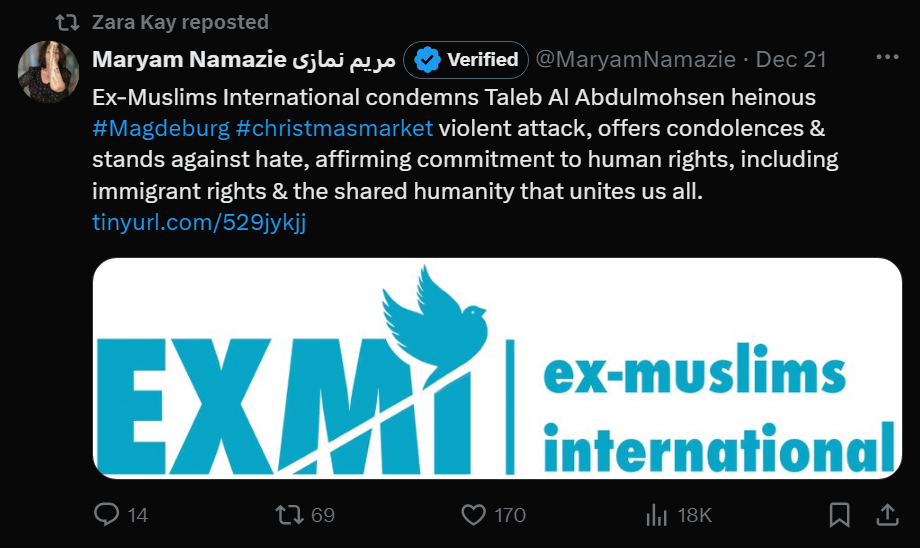 Εξετάζοντας το ιστορικό και την δημόσια δραστηριότητα του δράστη της επίθεσης στην χριστουγεννιάτικη αγορά του Μαγδεμβούργου στην Γερμανία, ο ισχυρισμός ότι πρόκειται για επίθεση ισλαμιστή είναι αβάσιμη. Ο Αλ-Αμπντουλμόχσεν, πρώην μουσουλμάνος και νυν άθεος, έχει επανειλημμένα ασκήσει δριμεία κριτική στο Ισλάμ με την πάροδο των χρόνων, ενώ κατηγορεί τη Γερμανία ότι επιχειρεί να “ισλαμοποιήσει” την Ευρώπη. Οι αναρτήσεις του δράστη, πολλές εκ των οποίων ήταν αναπαραγωγές ακροδεξιού περιεχομένου, στο σύνολο τους δεν δείχνουν καμία ιδεολογική ταύτιση με το Ισλάμ, αλλά αντίθετα αποτελούν παραδείγματα ισλαμοφοβικών δηλώσεων.