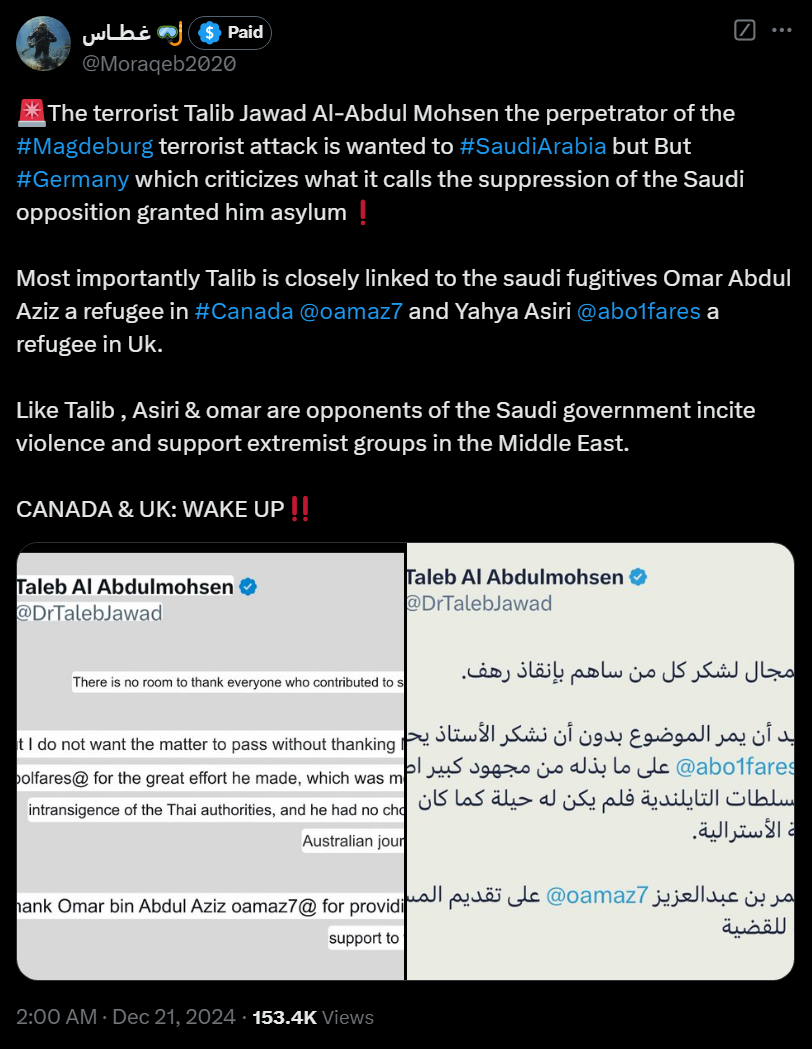 Το ένα πρόσωπο, που ονομάζεται Omar bin Abdulaziz, έχει δεχτεί καταγγελίες από υποστηρικτές της Σαουδικής Αραβίας για παλιότερες αναρτήσεις στο Χ, στις οποίες φαίνεται να δήλωνε υποστήριξη στις εξτρεμιστικές ISIS και Χαμάς. Ωστόσο, δεν στάθηκε δυνατό να επαληθεύσουμε την εγκυρότητα των ισχυρισμών, καθώς το εν λόγω υλικό εμφανίζεται διεγραμμένο. Σε κάθε περίπτωση, δεν υπάρχει καμιά άλλη ένδειξη για επαφή του Αλ-Αμπντουλμόχσεν με τον Omar bin Abdulaziz, εκτός της φυγάδευσης ενός προσώπου.