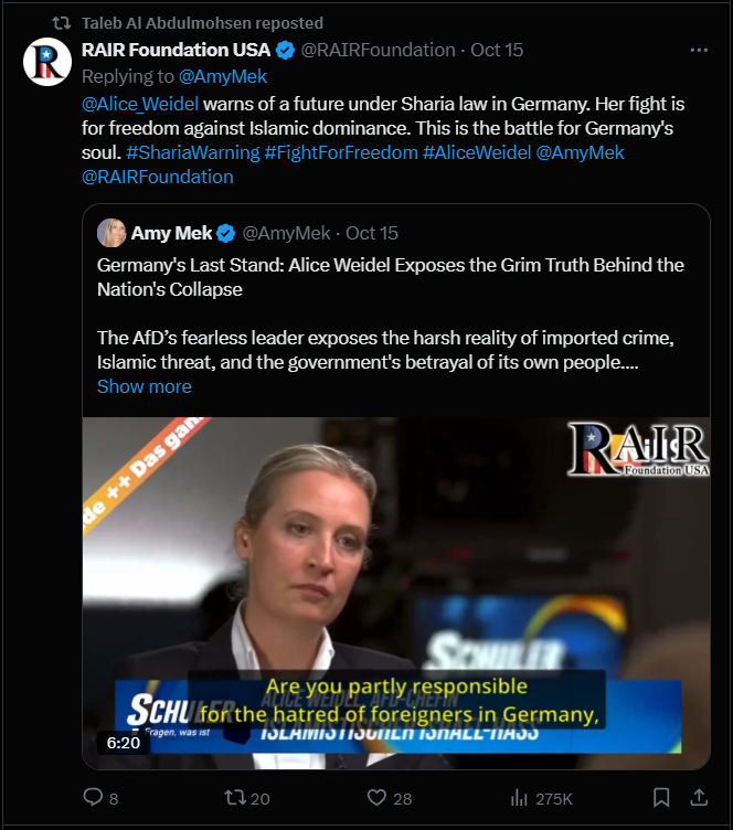 Αντίστοιχες δηλώσεις έκανε και σε αναρτήσεις του στα μέσα κοινωνικής δικτύωσης όπου δήλωνε ότι οι γερμανικές αρχές διώκουν Σαουδάραβες που ζητούν άσυλο για να καταστρέψει τις ζώες τους καθώς και ότι η Γερμανία θέλει να ισλαμοποιήσει την Ευρώπη.