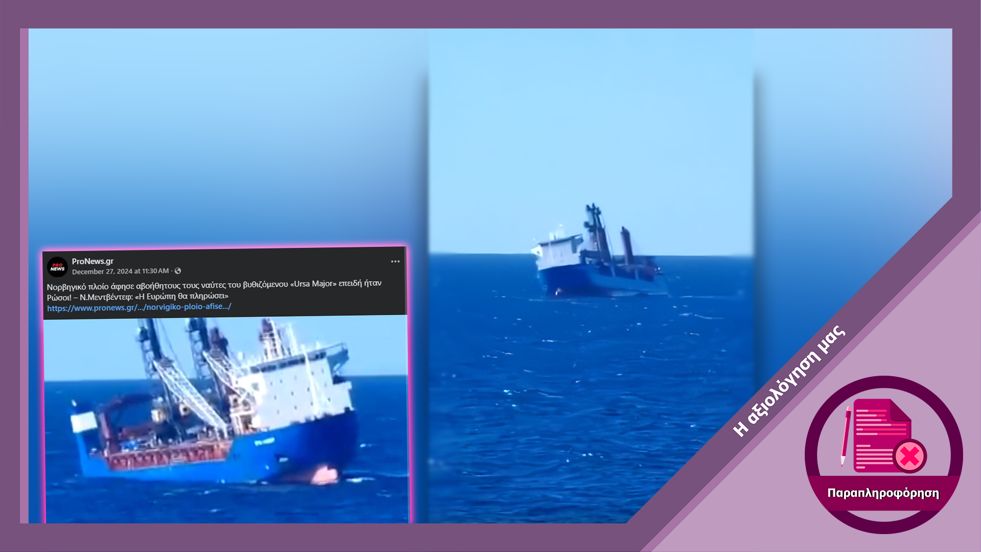 Ο ισχυρισμός ότι νορβηγικό φορτηγό πλοίο αγνόησε έκκληση για διάσωση και εγκατέλειψε πλήρωμα στην θάλασσα επειδή ήταν ρώσοι είναι ψευδής. Το πλήρωμα του ρωσικού φορτηγού πλοίου Ursa Major, το οποίο βυθίστηκε στις 23 Δεκεμβρίου 2024 λόγω εκρήξεων στον χώρο της μηχανής, έστειλε σήμα κινδύνου στην ισπανική ακτοφυλακή η οποία κινητοποίησε 2 σκάφη και ένα ελικόπτερο για την επιχείρηση διάσωσης. Το νορβηγικό φορτηγό πλοίο Oslo Carrier 3 το οποίο βρίσκονταν στην περιοχή δέχτηκε οδηγία από την ακτοφυλακή να μην συλλέξει το πλήρωμα καθώς βρίσκονταν ήδη καθ οδόν η αποστολή διάσωσης. Ωστόσο, όπως τεκμηριώνει και σχετικό φωτογραφικό υλικό, το πλήρωμα του Oslo Carrier 3 ασφάλισε την σωσίβια λέμβο με το πλήρωμα του Ursa Major και περίμενε σε επιφυλακή μέχρι να φτάσει η αποστολή διάσωσης.