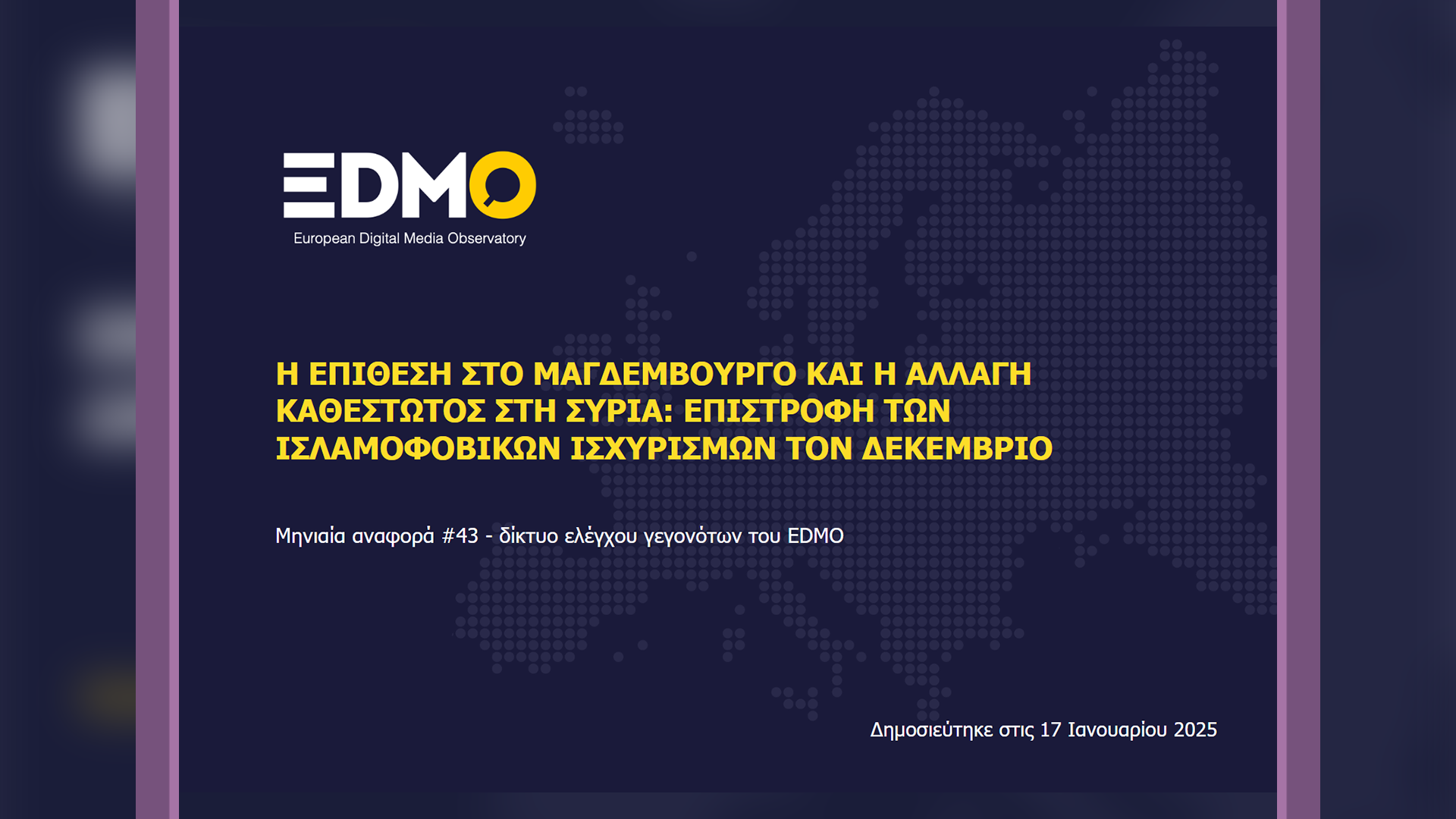 Οι 31 οργανισμοί-μέλη του δικτύου ελέγχου γεγονότων του EDMO, οι οποίοι συνεισέφεραν στοιχεία για την εν λόγω αναφορά, δημοσίευσαν συνολικά 1,481 άρθρα fact-checking μέσα στον Δεκέμβριο του 2024.Οι οργανισμοί ελέγχου γεγονότων που συνεισέφεραν υλικό γι’ αυτή την αναφορά: 15min, AFP, APA, Correctiv, Delfi, Demagog.cz, Demagog.pl, Demagog.sk, DPA, Eesti Päevaleht, EFE Verifica, Ellinika Hoaxes, Fact Check Cyprus, Factcheck Vlaanderen, Factico, FactReview, Faktisk, Funky, Greece Fact Check, Källkritikbyrån, InfoVeritas, Lakmusz, Logically Facts, Maldita, Newtral, Oštro, PagellaPolitica/Facta, Polígrafo, Pravda, Re:Baltica, The Journal Fact-Check, TjekDet, VerificaRTVE, Verificat. Θα βρείτε ολόκληρη την 43η αναφορά του EDMO στα αγγλικά εδώ και στα ελληνικά εδώ.