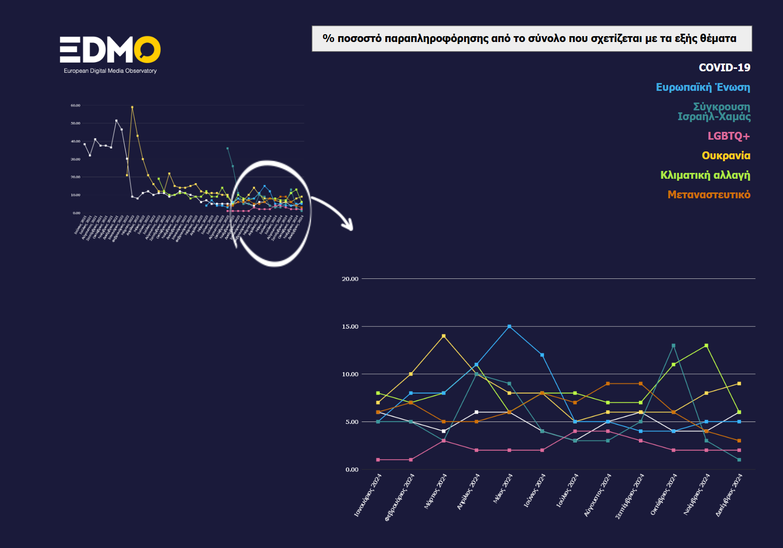 Στο πλαίσιο εξέτασης των τάσεων παραπληροφόρησης στην Ευρώπη, το Ευρωπαϊκό Παρατηρητήριο Ψηφιακών Μέσων (EDMO) μαζεύει στοιχεία από όλα τα μέλη του στην Ευρώπη αναφορικά με την θεματολογία που κάλυψαν τον προηγούμενο μήνα. Αυτή η αναφορά περιέχει οπτικοποιημένα στοιχεία για το ποιά θέματα απασχόλησαν τους οργανισμούς fact-checking στην Ευρώπη και δίνουν μια συνολική εικόνα των αφηγημάτων παραπληροφόρησης που περνάνε εθνικά σύνορα και εμφανίζονται με διαφορετικές μορφές σε πολλαπλές χώρες. Δεδομένου του ενδιαφέροντος που εμφανίζει αυτή η συνολική προσέγγιση στην ταυτοποίηση των τάσεων παραπληροφόρησης ανά διαφορετικές χρονικές περιόδους, ως FactReview παρουσιάζουμε αυτά τα στοιχεία στα ελληνικά με συνοπτική περιγραφή ώστε να υπάρχει η δυνατότητα, για όποιον ενδιαφέρεται, παρακολούθησης της κατάστασης διασποράς ψευδών ισχυρισμών στην Ευρώπη.