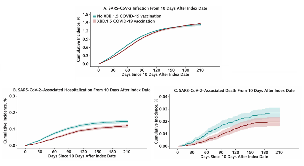 Μελέτη στο British Medical Journal που δημοσιεύθηκε τον Νοέμβριο του 202411Andersson, N. W., Thiesson, E. M., Pihlström, N., Perälä, J., Faksová, K., Gram, M. A., …Hviid, A. (2024). Comparative effectiveness of monovalent XBB.1.5 containing covid-19 mRNA vaccines in Denmark, Finland, and Sweden: target trial emulation based on registry data. BMJ Medicine, 3(1), e001074. doi: 10.1136/bmjmed-2024-001074 εξέτασε δεδομένα από σχεδόν 4 εκατομμύρια ανθρώπους από την Δανία, την Φιλανδία και την Σουηδία ηλικίας 65 ετών και άνω αναφορικά με την αποτελεσματικότητα των ενισχυτικών δόσεων κατά της παραλλαγής Όμικρον της COVID-19, όπως και οι προηγούμενες δυο μελέτες. Τα αποτελέσματα έδειξαν ότι, σε περίοδο 24 εβδομάδων, η ενισχυτική δόση με το μονοσθενές εμβόλιο για την παραλλαγή XBB.1.5 σχετίζονταν με 58% μείωση σε νοσηλεία και 75% μείωση σε θανάτους λόγω COVID-19. Ενώ η πιο ισχυρή προστασία σημειώθηκε τις πρώτες εβδομάδες, τα οφέλη έναντι σοβαρών επιπτώσεων από την νόσο διαρήθηκαν καθ όλη την περίοδο των 24 εβδομάδων, ειδικά στα πιο ευάλωτα άτομα.