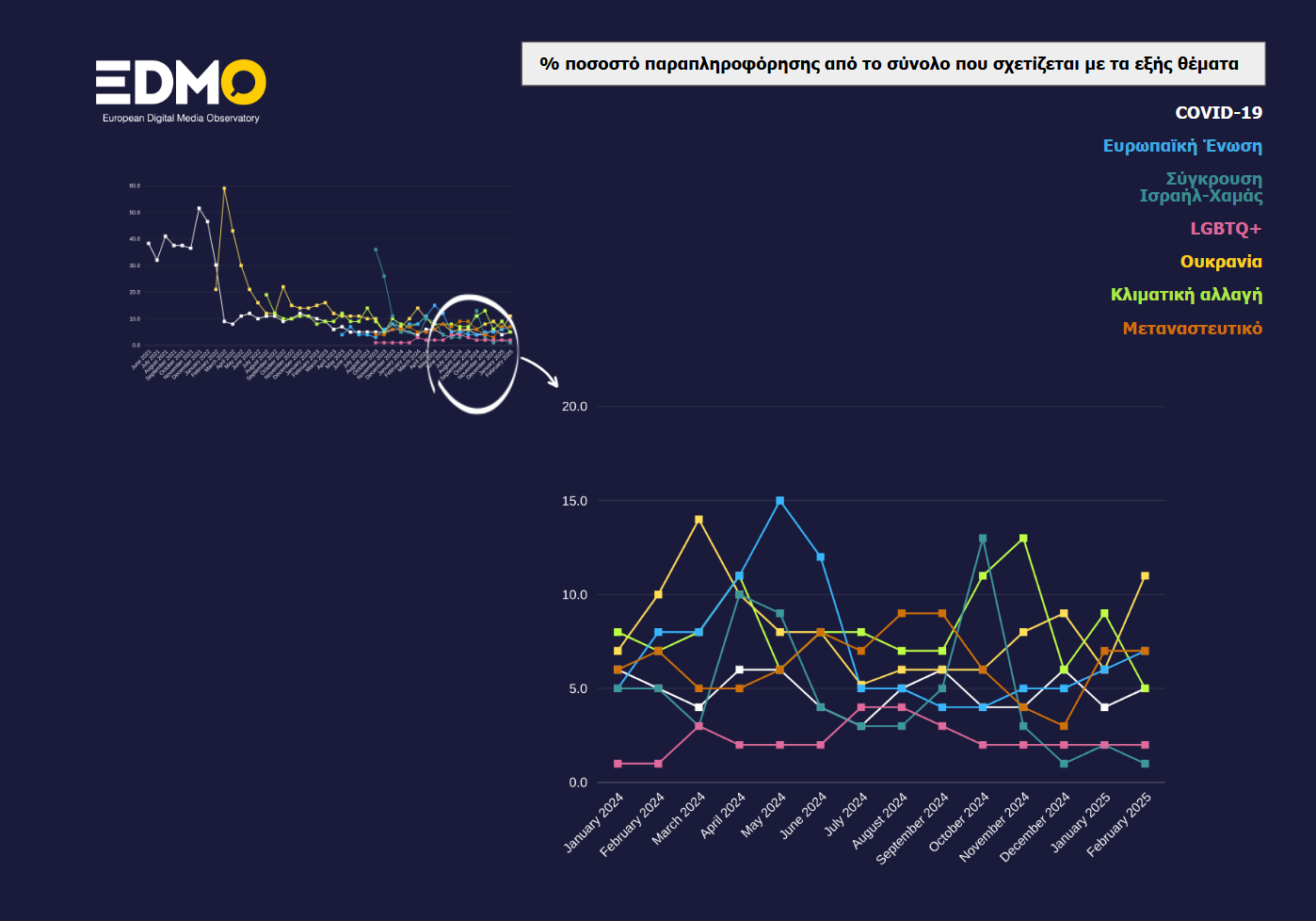 Η παραπληροφόρηση σχετικά με τον πόλεμο στην Ουκρανία σχεδόν διπλασιάστηκε τον Φεβρουάριο, ανεβαίνοντας από 6% τον προηγούμενο μήνα στο 11%, που είναι το υψηλότερο ποσοστό από τον Μάρτιο του 2024. Αυτή η αύξηση φαίνεται να οφείλεται εν μέρει στην υιοθέτηση από τον Πρόεδρο των ΗΠΑ Ντόναλντ Τραμπ ορισμένων φιλορωσικών ψευδών αφηγήσεων σχετικά με την κατάσταση στην Ουκρανία, τον ηγέτη της, και τις ευθύνες για τη σύγκρουση. Τα ποσοστά των ψευδών ειδήσεων για την ΕΕ και τον Covid-19 αυξήθηκαν επίσης, αν και σε μικρότερο βαθμό.