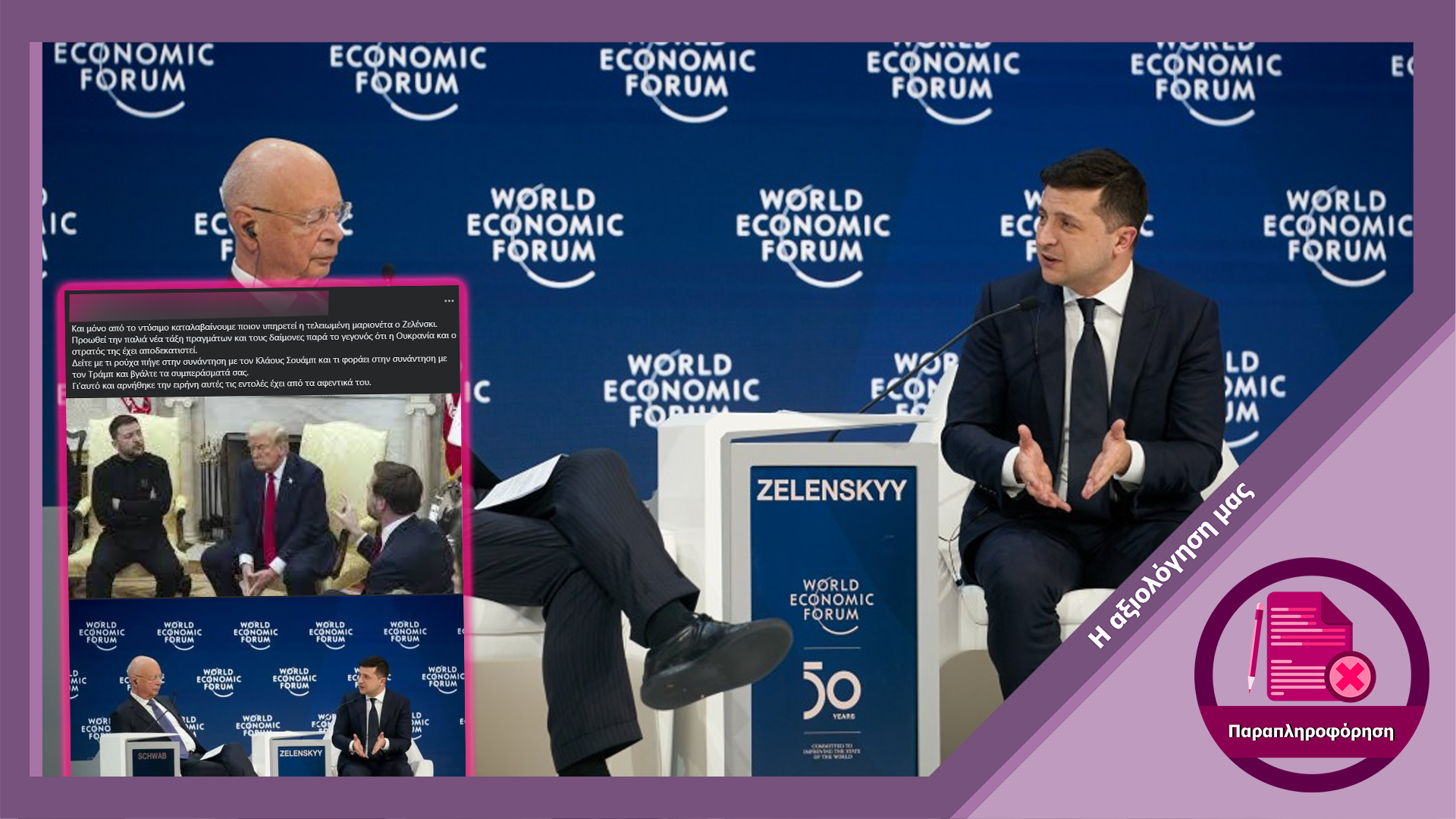 Αναρτήσεις στα μέσα κοινωνικής δικτύωσης αναπαράγουν φωτογραφία του ουκρανού προέδρου Βολοντίμιρ Ζελένσκι με κουστούμε σε πάνελ του Παγκόσμιου Οικονομικού Φόρουμ την οποία παρουσιάζουν ως φωτογραφία του 2025. Ο ισχυρισμός που συνοδεύει τις αναρτήσεις είναι πως ενώ ο ουκρανός πρόεδρος εμφανίστηκε με ανεπίσημη ενδυμασία στον Λευκό Οίκο, στο ΠΟΦ μίλησε φορώντας κουστούμι. Ωστόσο η φωτογραφία του Ζελένσκι από το ΠΟΦ δείχνει εκδήλωση από το 2020.