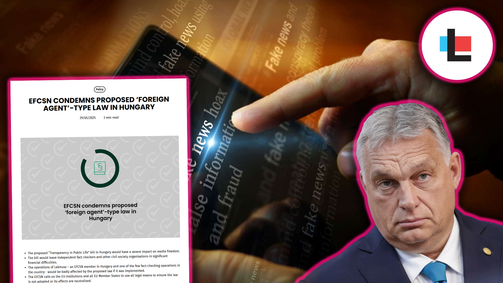 Τον Μάιο του 2025 η κυβέρνηση Όρμπαν κατέθεσε το νομοσχέδιο «Διαφάνεια στον Δημόσιο Βίο», το οποίο δίνει στο νεοσύστατο Γραφείο Προστασίας της Κυριαρχίας (GPK) την εξουσία να καταρτίζει λίστα «ξένως χρηματοδοτούμενων» οργανώσεων, να παρακολουθεί τους τραπεζικούς τους λογαριασμούς και να μπλοκάρει τη χρηματοδότησή τους, αν κρίνει ότι «επιδρούν στη δημόσια ζωή». Δεκάδες οργανώσεις ανθρωπίνων δικαιωμάτων, δίκτυα δημοσιογραφίας και φορείς της ΕΕ προειδοποιούν ότι η διάταξη αντιγράφει τους ρωσικής έμπνευσης νόμους περί «ξένων πρακτόρων» και συνιστά τη σοβαρότερη απειλή για την ανεξάρτητη ενημέρωση και την κοινωνία των πολιτών στην Ουγγαρία από το 2010. Μεταξύ των πλέον εκτεθειμένων βρίσκεται το Lakmusz, ο μοναδικός πιστοποιημένος (από τον IFCN και τον EFCSN) οργανισμός fact-checking της χώρας, ο οποίος βασίζεται σχεδόν αποκλειστικά σε ευρωπαϊκές επιχορηγήσεις. Η Ευρωπαϊκή Επιτροπή έχει προειδοποιήσει για άμεση προσφυγή στο ΔΕΕ, ενώ πάνω από 300 ΜΚΟ ζητούν την απόσυρση του νομοσχεδίου. Το Ευρωπαϊκό Δίκτυο Προτύπων Ελέγχου Γεγονότων (EFCSN) έχει εκδόσει σχετική ανακοίνωση καταδικάζοντας την εν λόγω επίθεση στην ελευθερία του τύπου και στην δράση οργανισμών fact-checking, την οποία μπορείτε να διαβάσετε εδώ.