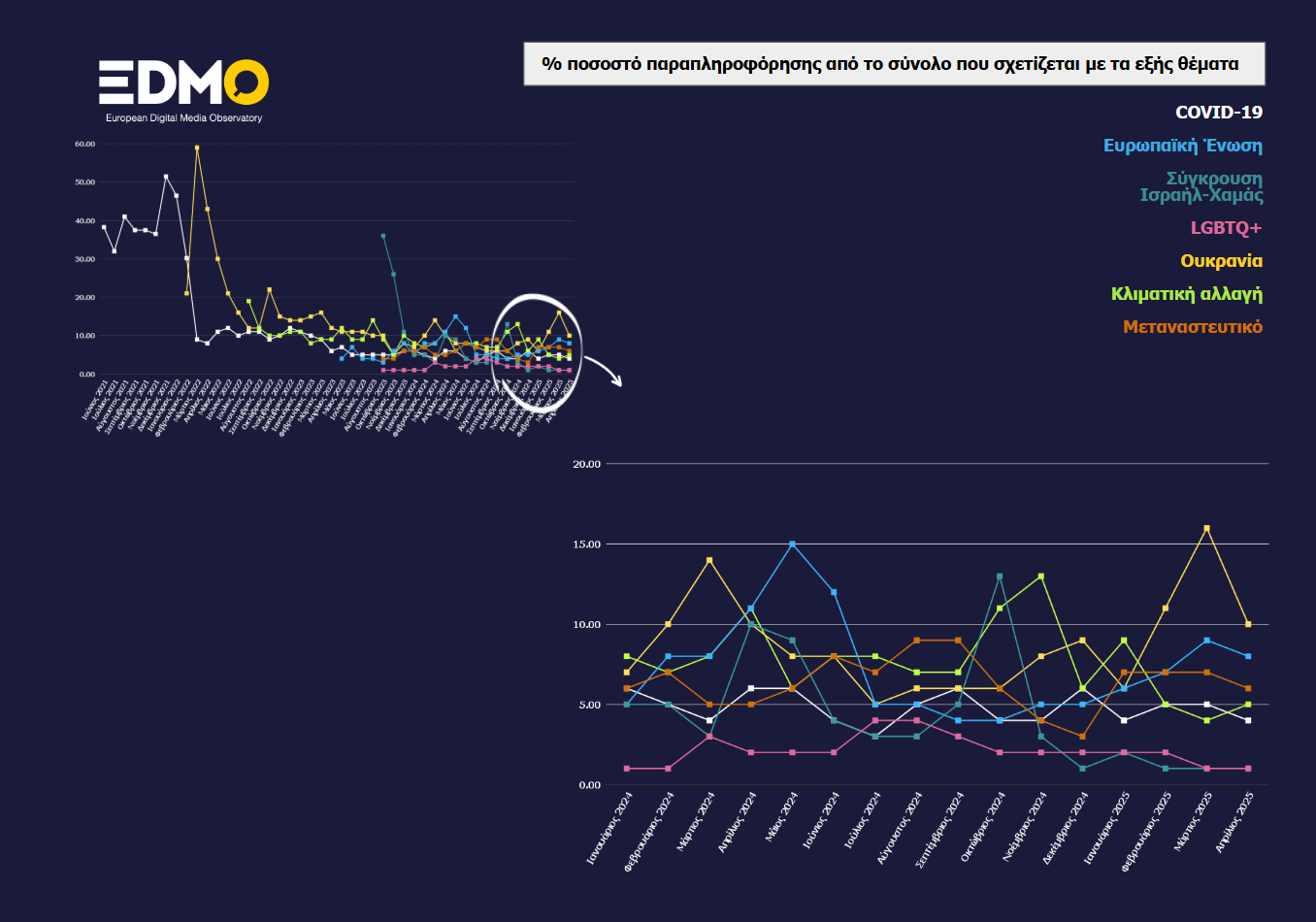 Μετά την άνοδο που σημείωσε τον Μάρτιο και τον Απρίλιο, η ψευδής πληροφόρηση σχετικά με τον πόλεμο στην Ουκρανία μειώθηκε κατά 6 ποσοστιαίες μονάδες, επιστρέφοντας στα επίπεδα που είχε στο τέλος του 2024. Αυτό πιθανότατα οφείλεται στο αδιέξοδο στις διαπραγματεύσεις αλλά και στη σχετικά μικρότερη προβολή των ειδήσεων από το πεδίο των μαχών. Η παραπληροφόρηση σχετικά με την ΕΕ σταθεροποιείται μετά την άνοδο των τελευταίων μηνών, ενώ οι ψευδείς αναφορές για την κλιματική αλλαγή σημειώνουν μικρή αύξηση, πιθανώς ως συνέπεια του γενικού blackout στην Ισπανία.