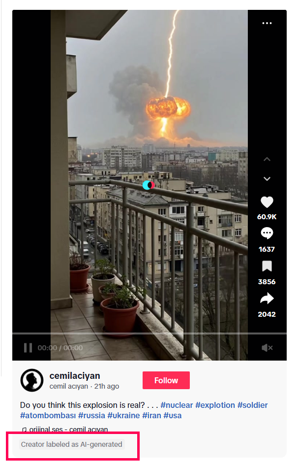 Στην προκειμένη περίπτωση οι πηγές αναπαραγωγής ήταν κατά βάση μεμονωμένοι λογαριασμοί στα μέσα κοινωνικής δικτύωσης. Χρησιμοποιώντας αντίστροφη αναζήτηση εικόνας στα καρέ του βίντεο καταφέραμε να εντοπίσουμε διαφορετικές αναπαραγωγές οι οποίες έφταναν μέχρι τις 18 Ιουνίου 2025. Εξετάζοντας τα σχόλια εντοπίσαμε την αρχική πηγή του βίντεο που διαμοιράζονταν σε όλους τους εξεταζόμενους λογαριασμούς. Πρόκειται για βίντεο που ανέβηκε αρχικά στο TikTok στις 18 Iουνίου από τον λογαριασμό @cemilaciyan. Ο λογαριασμός φαίνεται ότι δημοσιεύει κατά βάση βίντεο τα οποία έχουν δημιουργηθεί με χρήση λογισμικού AI, γνωστοποιώντας ότι δεν πρόκειται για πραγματικά βίντεο.