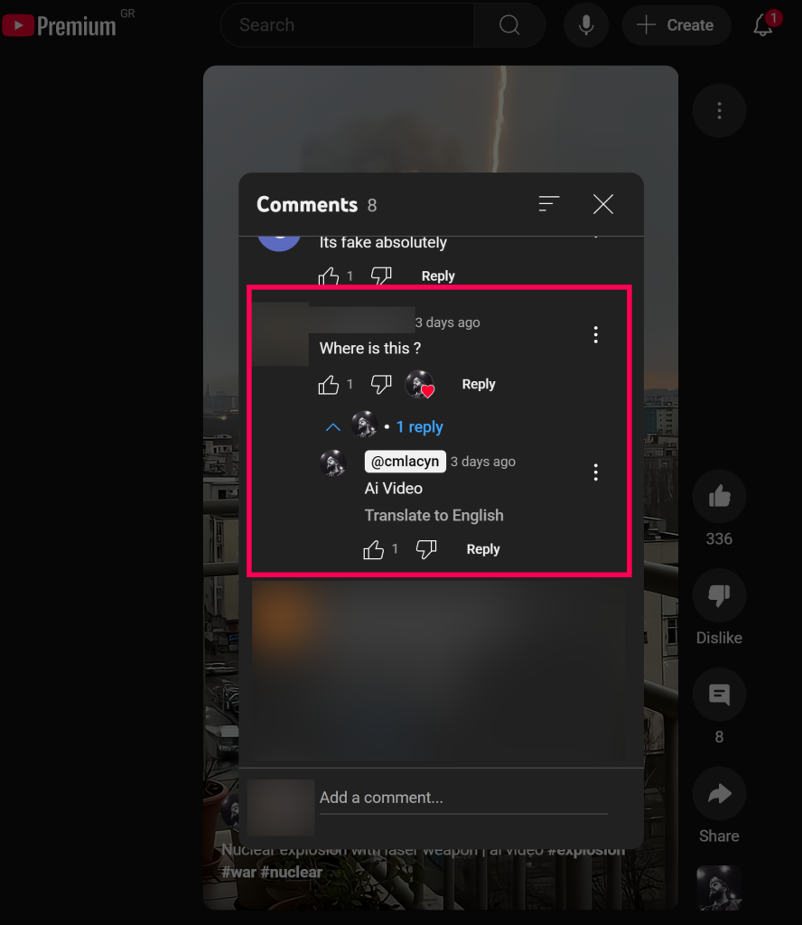 Μάλιστα, είναι σκόπιμο να σημειώσουμε πως, πέρα από το ότι ο χρήστης ταυτοποίησε το βίντεο ως δημιουργία λογισμικού AI στο TikTok, το δήλωσε και σε ερώτηση χρήστη στο YouTube: