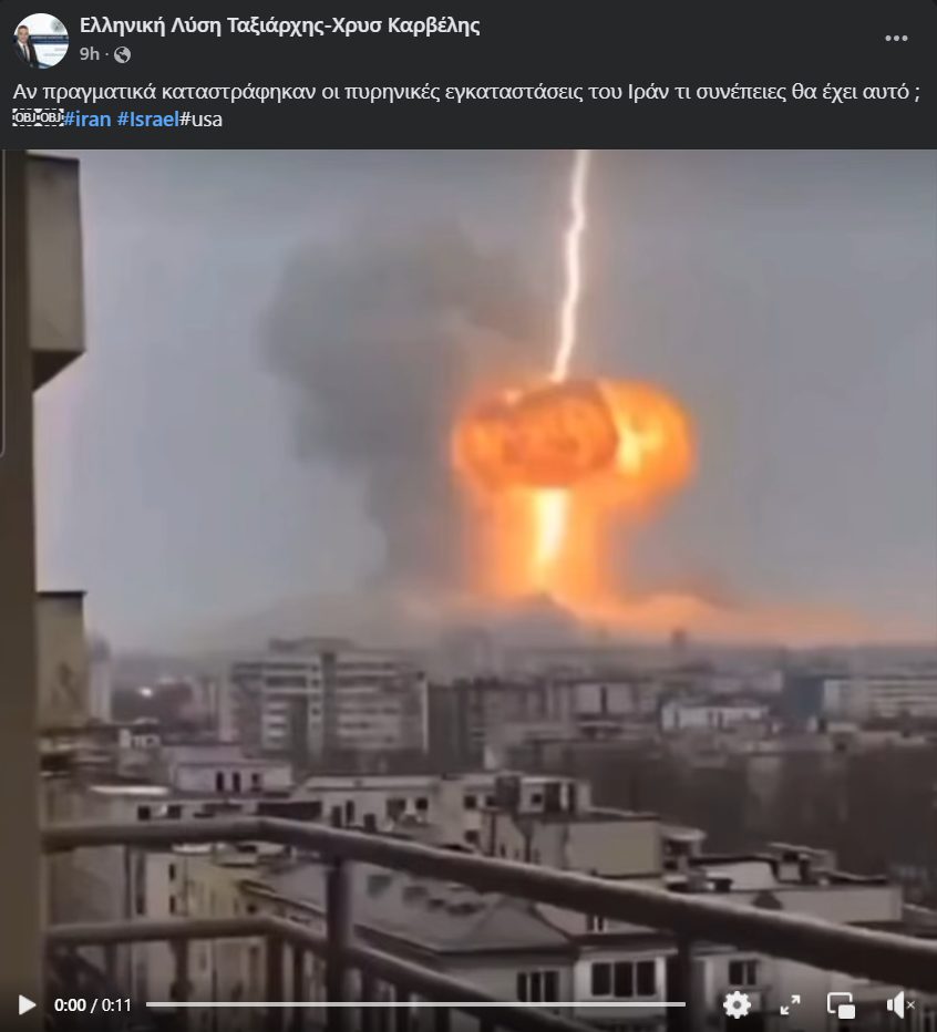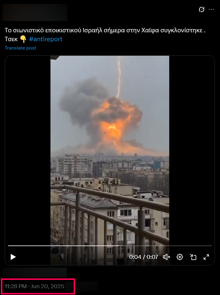 Το βίντεο που υποτίθεται πως δείχνει έκρηξη από βομβιστική επίθεση στο πλαίσιο του πολέμου Ισραήλ-Ιράν δεν είναι πραγματικό. Το βίντεο παρουσιάζεται από διαφορετικούς λογαριασμούς είτε ως επίθεση των ΗΠΑ στις πυρηνικές εγκαταστάσεις του Ιράν ή ως επίθεση του Ιράν στην Χάιφα του Ισραήλ. Ωστόσο το αρχικό βίντεο αναρτήθηκε στις 18 Ιουνίου 2025 στο TikTok, πριν και από τις δυο επιθέσεις, από λογαριασμό ο οποίος δημοσιεύει βίντεο που έχουν δημιουργηθεί με χρήση λογισμικού τεχνητής νοημοσύνης. Στην αρχική ανάρτηση του επίμαχου βίντεο ο λογαριασμός είχε τοποθετήσει σχετική επισήμανση η οποία ταυτοποιούσε το βίντεο ως προϊόν λογισμικού AI.
