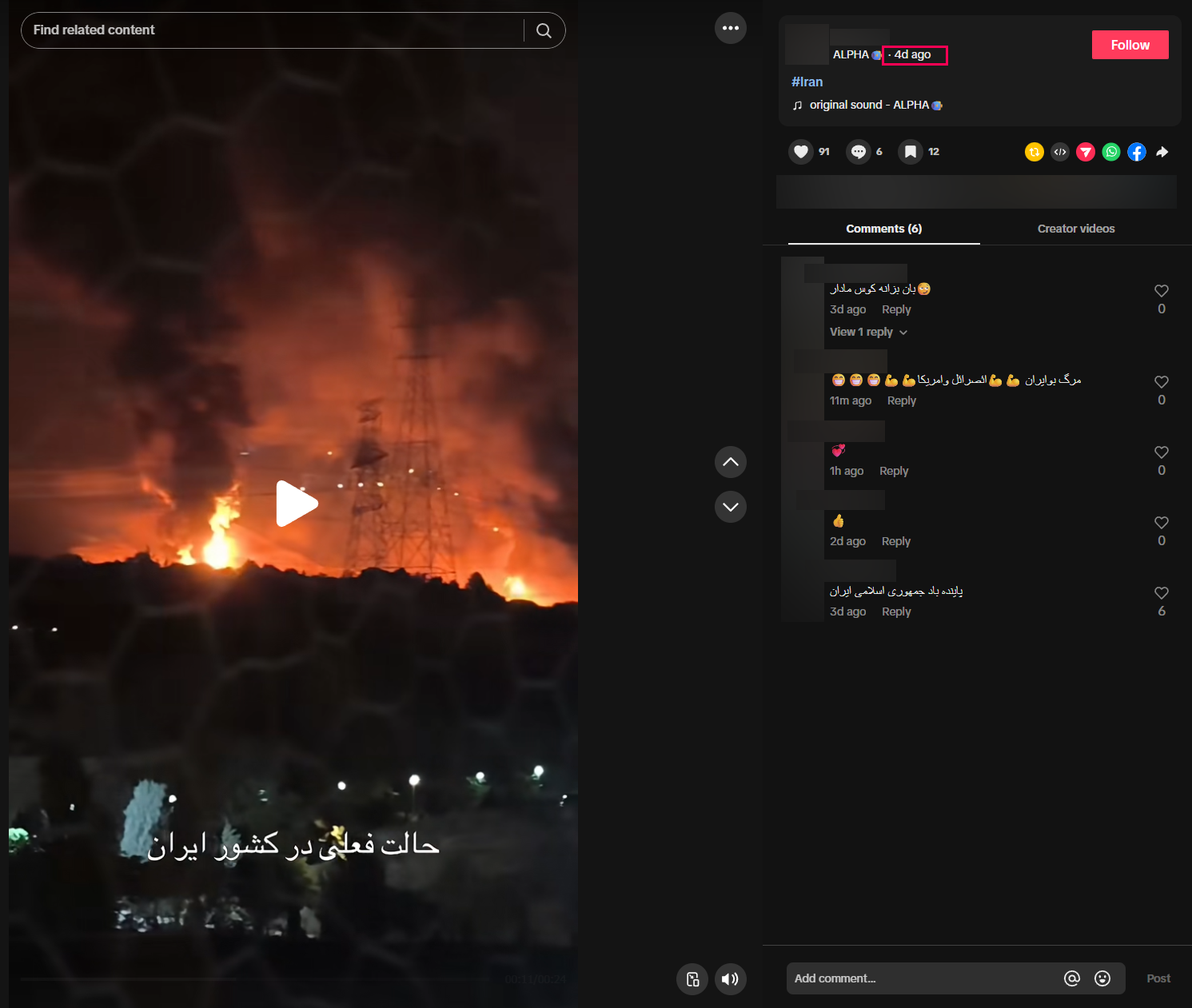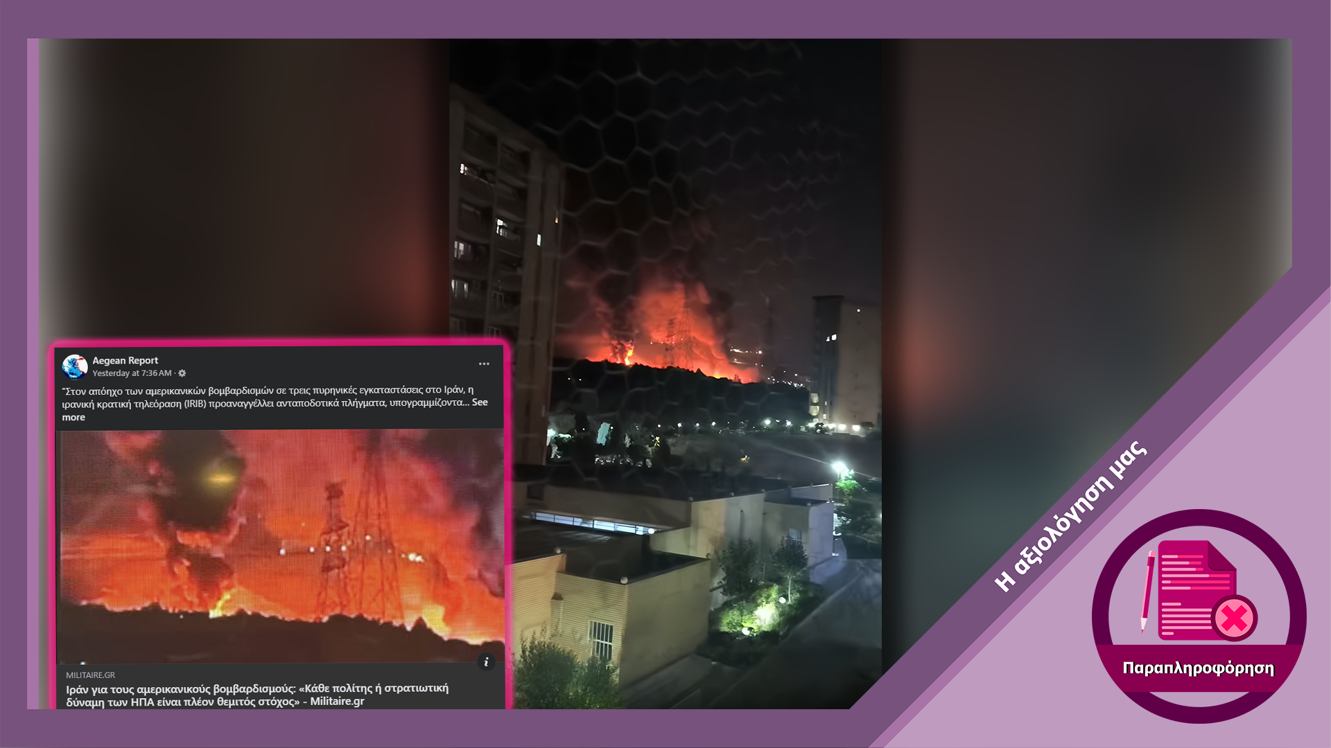 Τα στιγμιότυπα που αναπαράγονται στα μέσα κοινωνικής δικτύωσης παρουσιάζονται ψευδώς ως σχετικά με την επίθεση των ΗΠΑ στις πυρηνικές εγκαταστάσεις του Ιραν στις 22 Ιουνίου 2025. Στην πραγματικότητα πρόκειται για πλάνα από πυρκαγιά που έλαβε χώρα στην αποθήκη πετρελαίου της περιοχής Shahran στην Τεχεράνη στις 15 Ιουνίου 2025, μετά από τις πυραυλικές επιθέσεις του Ισραήλ στην πρωτεύουσα του Ιράν.