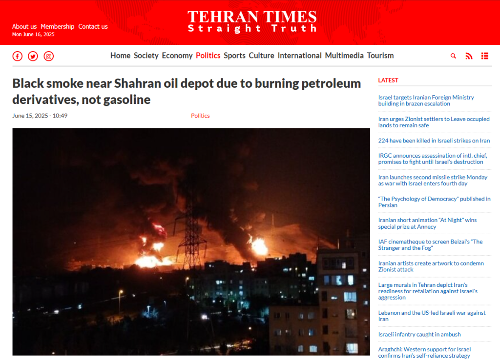 Το βίντεο δείχνει πυρκαγιά σε αποθήκη πετρελαίου στην περιοχή Shahran στην βορειοδυτική πλευρά της Τεχεράνης μετά από την πυραυλική επίθεση του Ισραήλ στις 15 Ιουνίου 2025 και δεν έχει καμία σχέση με την επίθεση των ΗΠΑ στις πυρηνικές εγκαταστάσεις του Ιραν στις 22 Ιουνίου 2025.