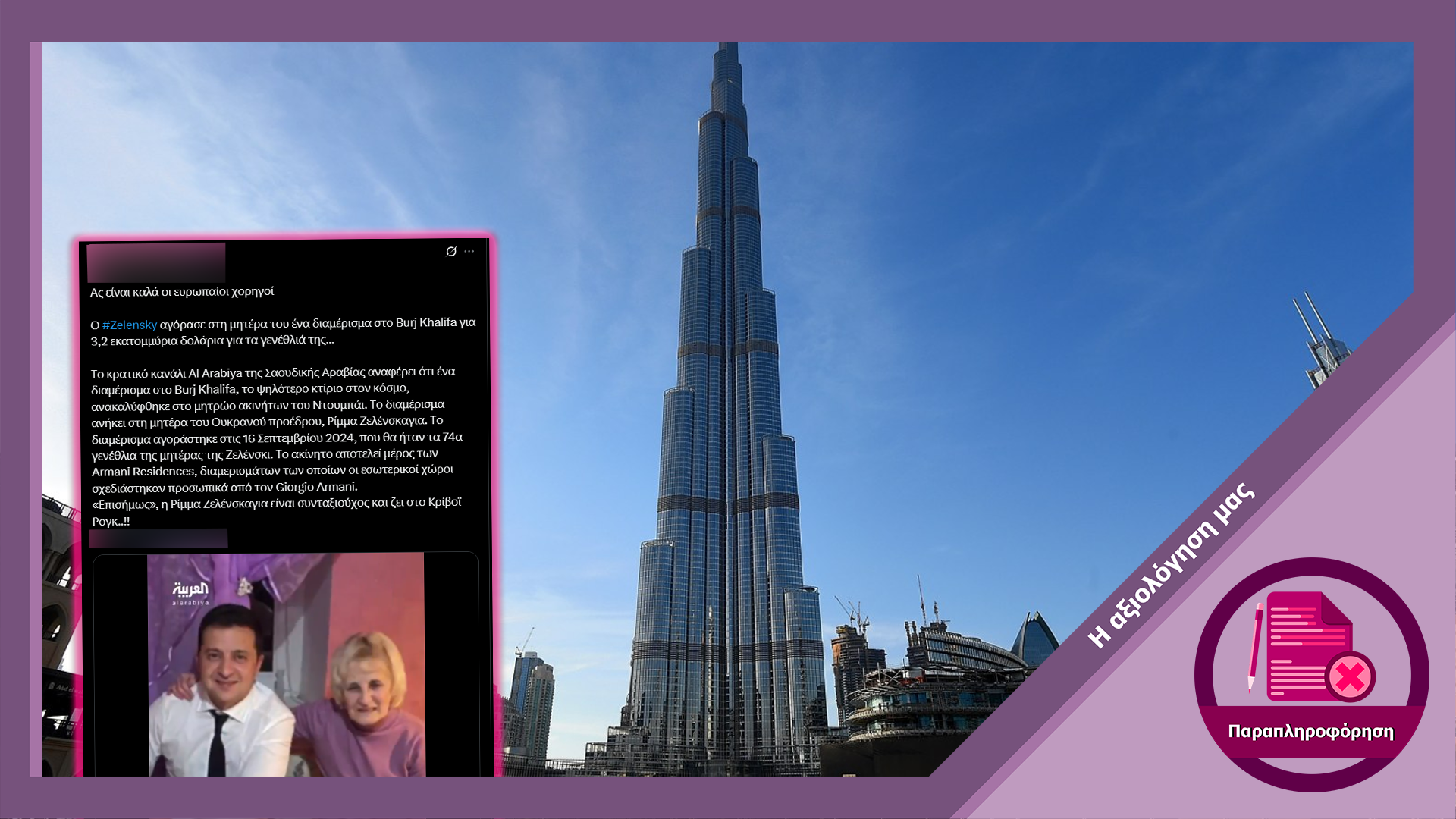Δημοσιεύματα και αναρτήσεις στα μέσα κοινωνικής δικτύωσης αναπαράγουν τον ισχυρισμό ότι ο Ουκρανός πρόεδρος Βολοντίμιρ Ζελένσκι αγόρασε διαμέρισμα στον ουρανοξύστη Μπουρτζ Χαλίφα στο Ντουμπάι για την μητέρα του. Ο ισχυρισμός περιλαμβάνει κατηγορίες για κατάχρηση χρημάτων που έχουν σταλεί για την υποστήριξη της Ουκρανίας στον πόλεμο με την Ρωσία, ένα αφήγημα το οποίο είναι ιδιαίτερα συχνό από τη έναρξη του πολέμου μέχρι σήμερα. Ωστόσο ο επίμαχος ισχυρισμός είναι ψευδής.