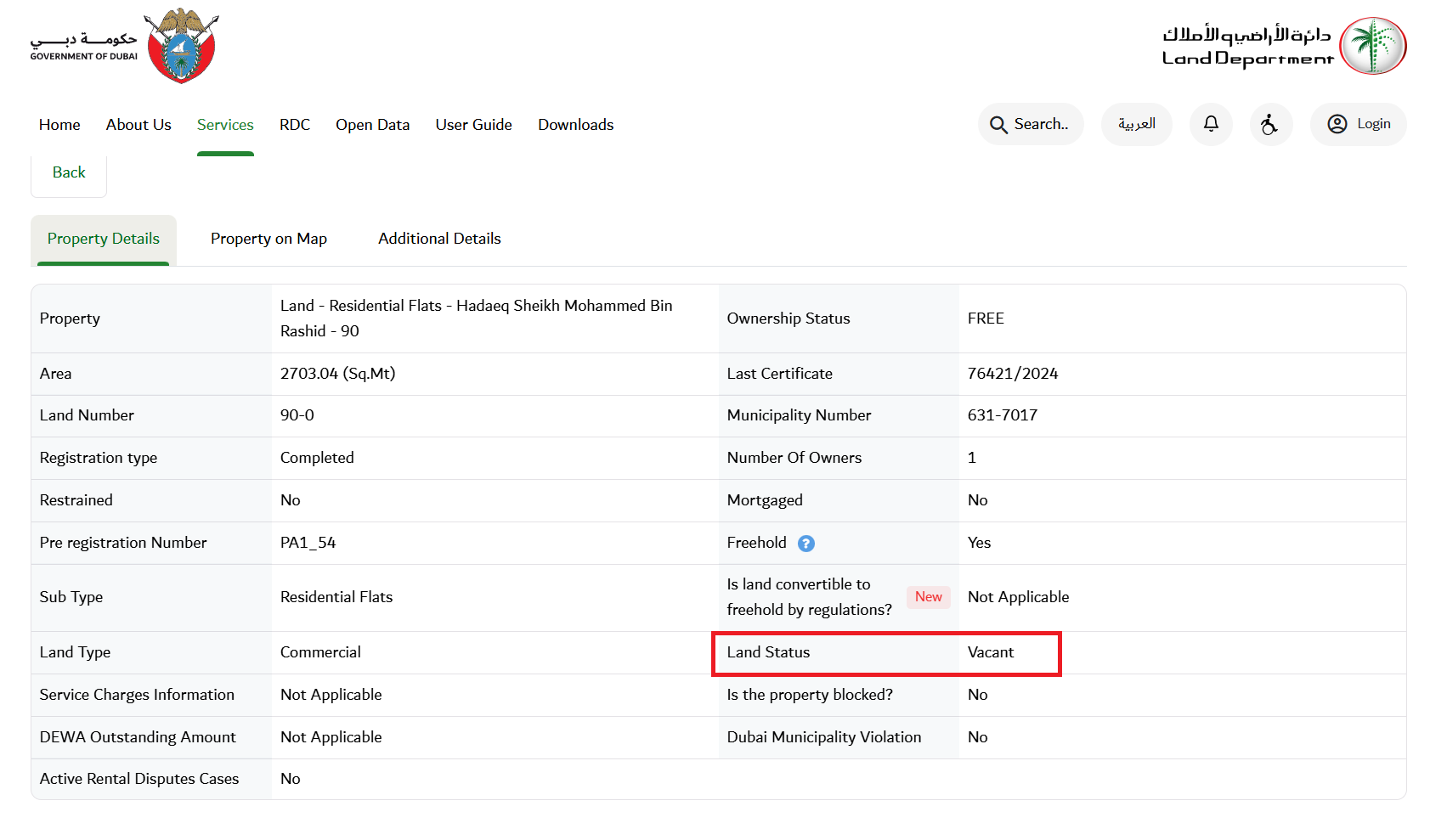 Αρχικά, πρέπει να σημειωθεί ότι με δοκιμή σάρωσης του κωδικού QR από το αρχικό βίντεο, με πλήρη ανάλυση, και χρησιμοποιώντας πολλαπλές διαφορετικές συσκευές δεν ήταν δυνατή η εύρεση αποτελέσματος, γεγονός που συνηγορεί υπέρ του συμπεράσματος ότι δεν πρόκειται για αυθεντικό έγγραφο. Επιπρόσθετα, η κυβέρνηση του Dubai διατηρεί βάση δεδομένων για υπηρεσίες που αφορούν την διαχείρηση ακινήτων. Συνεπώς, χρησιμοποιώντας τα στοιχεία από το εικονιζόμενο έγγραφο, συγκεκριμένα τον κωδικό του συμβολαίου, πραγματοποιήσαμε σχετική αναζήτηση στην βάση δεδομένων. Το αποτέλεσμα δείχνει ενεργό ακίνητο στην περιοχή “Hadaeq Sheikh Mohammed Bin Rashid”. To Burj Khalifa βρίσκεται στο κέντρο του Dubai, περίπου 10 χιλιόμετρα μακριά από την εν λόγω περιοχή.