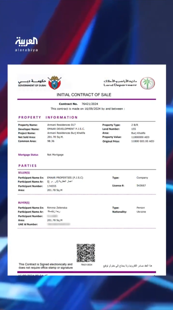 Σύμφωνα με σχετικό ρεπορτάζ του μέσου Al Arabiya Ο Ουκρανός πρόεδρος, Βολοντίμιρ Ζελένσκι αγόρασε διαμέρισμα στον ουρανοξύστη Μπούρτζ Καλίφα στο Ντουμπάι για την μητέρα του μέσω κατάχρασης χρημάτων που έχουν δοθεί για την ενίσχυση της Ουκρανίας στον πόλεμο με την Ρωσία.