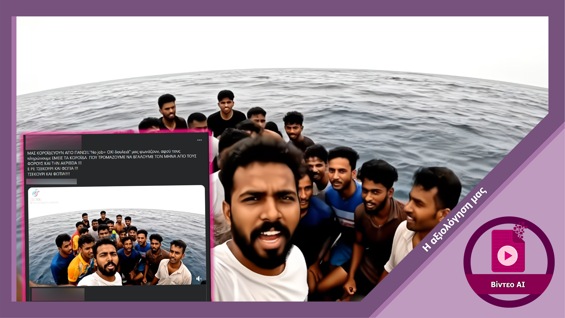 Χρήστες μέσων κοινωνικής δικτύωσης αναπαράγουν ένα βίντεο το οποίο υποτίθεται πως δείχνει μετανάστες μέσα σε βάρκα να βγάζουν βίντεο με το κινητό φωνάζοντας το σύνθημα “όχι δουλειά, μόνο επιδόματα”. Ωστόσο το εν λόγω βίντεο δεν είναι πραγματικό, αλλά δημιουργήθηκε με χρήση λογισμικού τεχνητής νοημοσύνης.