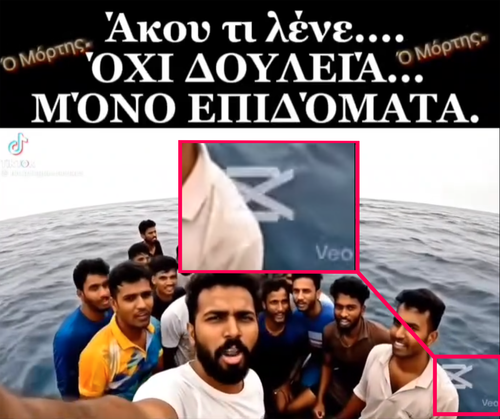 Το βίντεο που υποτίθεται πως δείχνει μετανάστες σε βάρκα να φωνάζουν “όχι δουλειά, μόνο επιδόματα” δεν είναι πραγματικό, αλλά δημιουργήθηκε με λογισμικό τεχνητής νοημοσύνης. Συγκεκριμένα πρόκειται για το μοντέλο Veo 3 της Google που κυκλοφόρησε τον Μάιο του 2025 και το υδατογράφημα του μοντέλου είναι εμφανές στην κάτω δεξιά γωνία του επίμαχου βίντεο. Επίσης, πέρα από το υδατογράφημα εντοπίζονται αρκετά καρέ του βίντεο με μπλεγμένα άκρα ή τμήματα προσώπων που λείπουν, σημεία τα οποία είναι ενδεικτικά βίντεο που έχει δημιουργηθεί με χρήση AI.