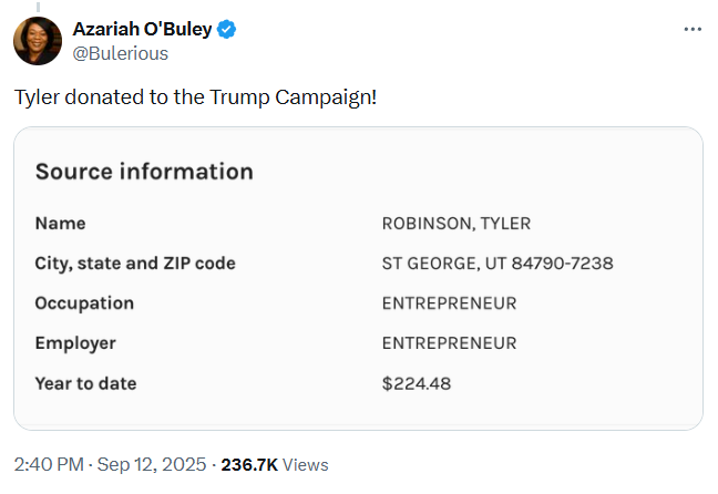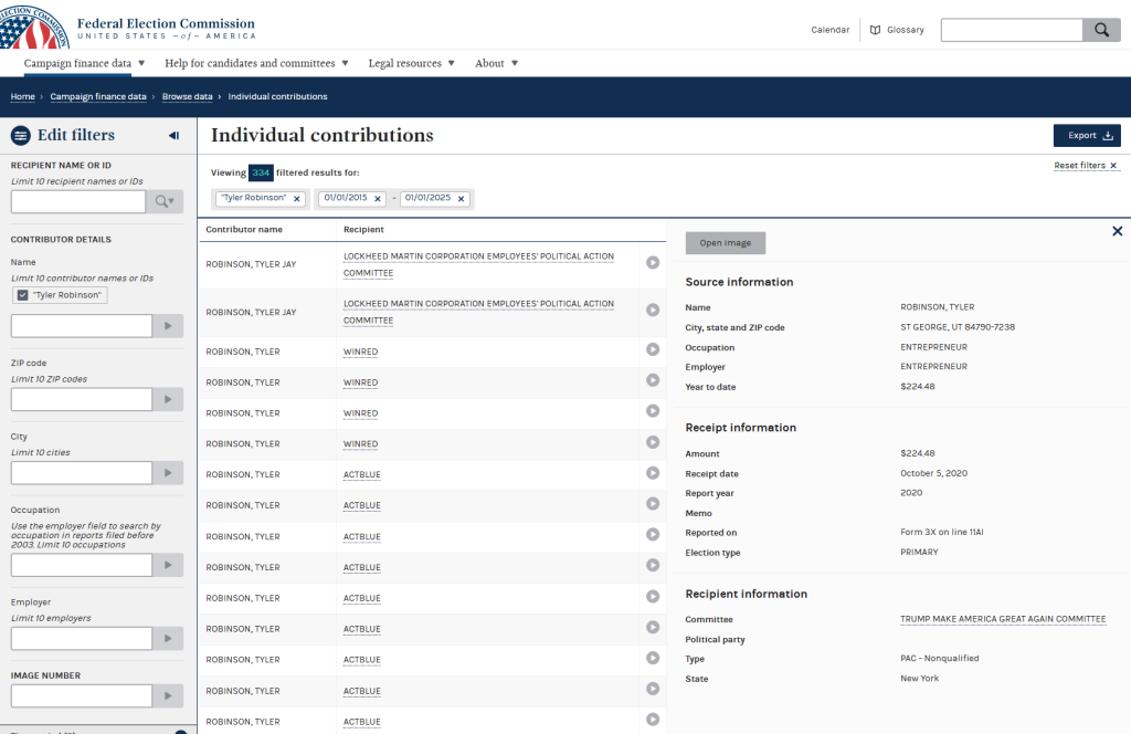 Στις Ηνωμένες Πολιτείες υπάρχει βάση δεδομένων η οποία καταγράφει τα στοιχεία των δωρεών σε πολιτικούς και πολιτικές επιτροπές λόγω εκλογών. Εξετάζοντας τη λίστα της ομοσπονδιακής υπηρεσίας FEC (Federal Election Commission) με το όνομα Tyler Robinson και ψάχνοντας επιτροπές που σχετίζονταν με τον Trump από το 2015 μέχρι το 2025 εντοπίζεται μόνο μία δωρεά το 2020.