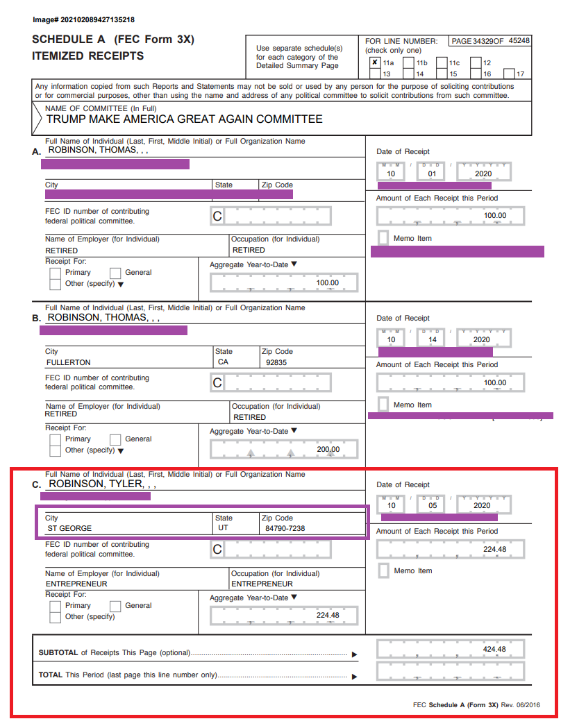 Από το έντυπο της δωρεάς βλέπουμε ότι ο Tyler Robinson που έκανε την δωρεά, και είχε καταγραφεί ως επιχειρηματίας, δήλωσε διεύθυνση κατοικίας “St. George” στην Γιούτα.