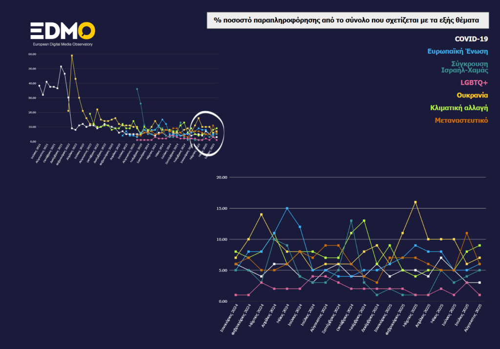 Το θέμα που στοχοποιήθηκε περισσότερο από παραπληροφόρηση τον Αύγουστο ήταν η κλιματική αλλαγή, συνεχίζοντας την αυξητική τάση του προηγούμενου μήνα. Αυξήθηκαν επίσης τα ψευδή δημοσιεύματα για τον πόλεμο στην Ουκρανία και για την Ευρωπαϊκή Ένωση, όπως και για την κρίση στη Γάζα, με τη διαρκή, από τον Ιούλιο, αφήγηση ότι ο λιμός είτε δεν είναι πραγματικός είτε παρουσιάζεται υπερβολικά διογκωμένος. Ενώ το μερίδιο ψευδών ιστοριών για τη μετανάστευση και τα ζητήματα ΛΟΑΤΚΙ+ μειώθηκε σε σχέση με τον προηγούμενο μήνα, η παραπληροφόρηση για τα υπόλοιπα θέματα που παρακολουθούνται στο πλαίσιο των αναφορών του EDMO παρέμεινε σταθερή.