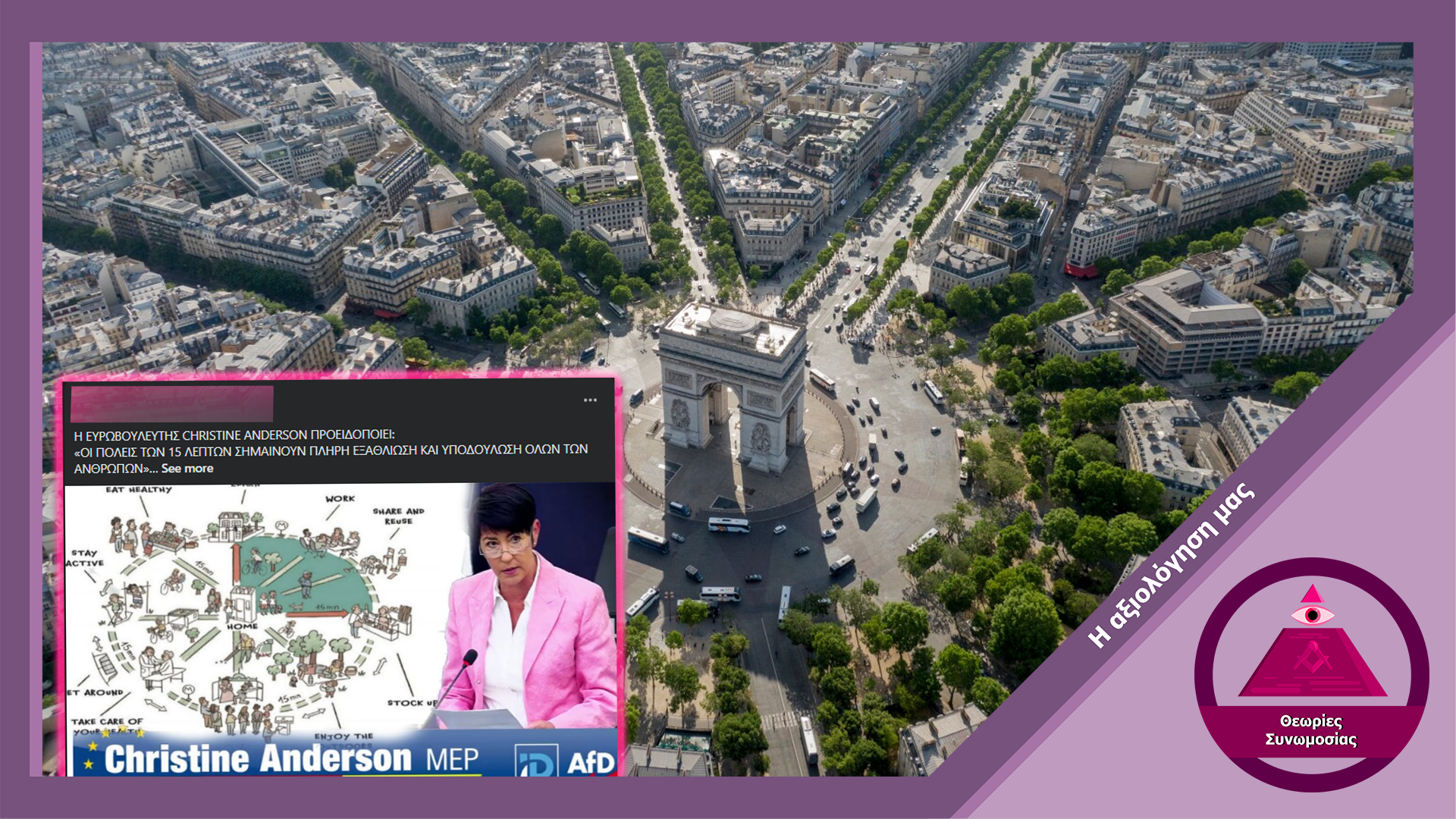Αναρτήσεις στα μέσα κοινωνικής δικτύωσης αναπαράγουν δηλώσεις Ευρωβουλεύτριας αναφορικά με ισχυρισμούς για την θεωρία συνωμοσίας περί κλιματικών lockdowns στο πλαίσιο χρήσης των πόλεων 15 λεπτών. Ωστόσο οι ισχυρισμοί για περιορισμούς μετακίνησης αναφορικά με τις πόλεις 15 λεπτών συνιστούν αβάσιμη συνωμοσιολογία, καθώς το μέτρο αφορά μόνο την πιο αποτελεσματική πρόσβαση πολιτών σε αγαθά και υπηρεσίες μειώνοντας την ανάγκη μεγάλων μετακινήσεων.