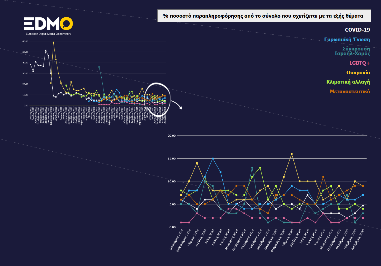 Στο πλαίσιο εξέτασης των τάσεων παραπληροφόρησης στην Ευρώπη, το Ευρωπαϊκό Παρατηρητήριο Ψηφιακών Μέσων (EDMO) μαζεύει στοιχεία από όλα τα μέλη του στην Ευρώπη αναφορικά με την θεματολογία που κάλυψαν τον προηγούμενο μήνα. Αυτή η αναφορά περιέχει οπτικοποιημένα στοιχεία για το ποιά θέματα απασχόλησαν τους οργανισμούς fact-checking στην Ευρώπη και δίνουν μια συνολική εικόνα των αφηγημάτων παραπληροφόρησης που περνάνε εθνικά σύνορα και εμφανίζονται με διαφορετικές μορφές σε πολλαπλές χώρες. Δεδομένου του ενδιαφέροντος που εμφανίζει αυτή η συνολική προσέγγιση στην ταυτοποίηση των τάσεων παραπληροφόρησης ανά διαφορετικές χρονικές περιόδους, ως FactReview παρουσιάζουμε αυτά τα στοιχεία στα ελληνικά με συνοπτική περιγραφή ώστε να υπάρχει η δυνατότητα, για όποιον ενδιαφέρεται, παρακολούθησης της κατάστασης διασποράς ψευδών ισχυρισμών στην Ευρώπη.