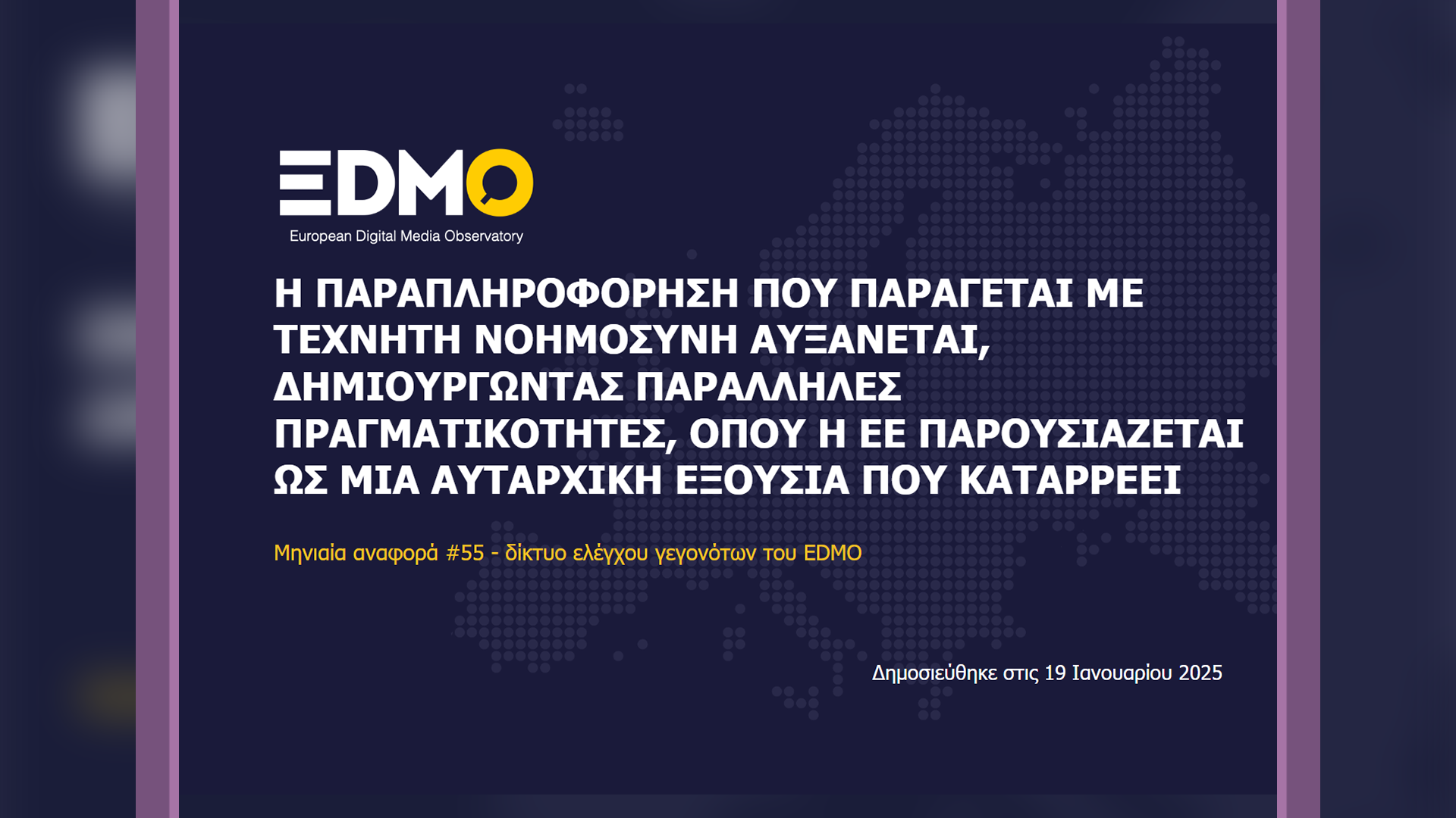 Οι 38 οργανισμοί του δικτύου ελέγχου γεγονότων του EDMO, οι οποίοι συνεισέφεραν στοιχεία για την εν λόγω αναφορά, δημοσίευσαν συνολικά 1,605 άρθρα fact-checking μέσα στον Δεκέμβριο του 2025.Οι οργανισμοί ελέγχου γεγονότων που συνεισέφεραν υλικό γι’ αυτή την αναφορά: APA, AFP, CORRECTIV, Delfi Lithuania, Delfi Estonia, Demagog.cz, Demagog.org.pl, Demagog.sk, Deutsche Welle, dpa, EFE Verifica, Ellinika Hoaxes, Fact Check Cyprus, FactReview, Factcheck Vlaanderen, Faktabaari, Faktisk, Funky Citizens, Greece Fact Check, INFOVERITAS, Källkritikbyrån, Knack, Lakmusz, Maldita.es, Newtral, Nieuwscheckers, Oštro, Pagella Politica/Facta, Polígrafo, Pravda Association, Media Provereno, Re:Baltica, MEFOS, The Journal Ireland, TjekDet, VerificaRTVE, VRT NWS, 15min. Θα βρείτε ολόκληρη την 55η αναφορά του EDMO στα αγγλικά εδώ και στα ελληνικά εδώ.