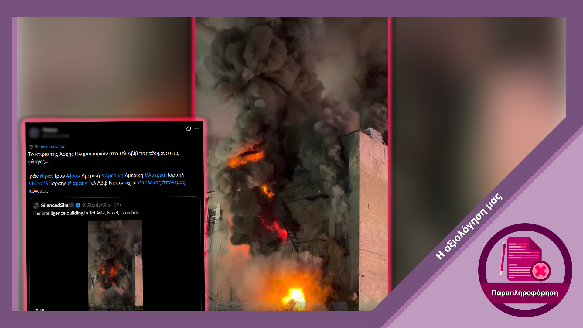 Στα μέσα κοινωνικής δικτύωσης κυκλοφόρησε βίντεο το οποίο υποτίθεται πως δείχνει το κτήριο της Αρχής Πληροφοριών στο Τελ Αβίβ να έχει πάρει φωτιά στο πλαίσιο των ιρανικών επιθέσεων στο Ισραήλ. Ωστόσο το βίντεο δείχνει περιστατικό στις ΗΠΑ όχι στο Ισραήλ.