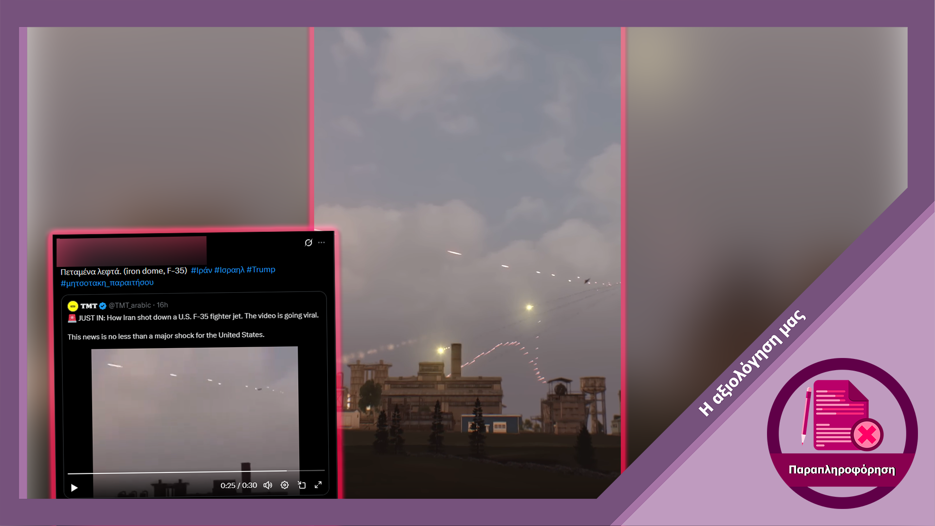 Στα μέσα κοινωνικής δικτύωσης κυκλοφορεί βίντεο που υποτίθεται ότι δείχνει αντιαεροπορικά συστήματα του Ιράν να καταρρίπτουν αμερικανικό μαχητικό F-35. Ωστόσο, το εν λόγω βίντεο προέρχεται από βιντεοπαιχνίδι πολεμικής προσομοίωσης και δεν αποτυπώνει πραγματικό περιστατικό.