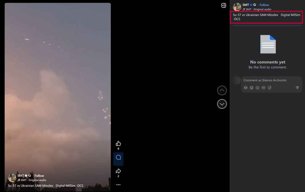 Χρησιμοποιώντας χαρακτηριστικά στιγμιότυπα από το βίντεο, πραγματοποιήσαμε αντίστροφη αναζήτηση εικόνας, εντοπίζοντας το τελικά σε ανάρτηση που έγινε στις 2 Ιουνίου 2025 στο Facebook. Στην περιγραφή του βίντεο περιλαμβάνεται το κείμενο “Su-57 vs Ukrainian SAM Missiles Digital MilSim – DCS”.
