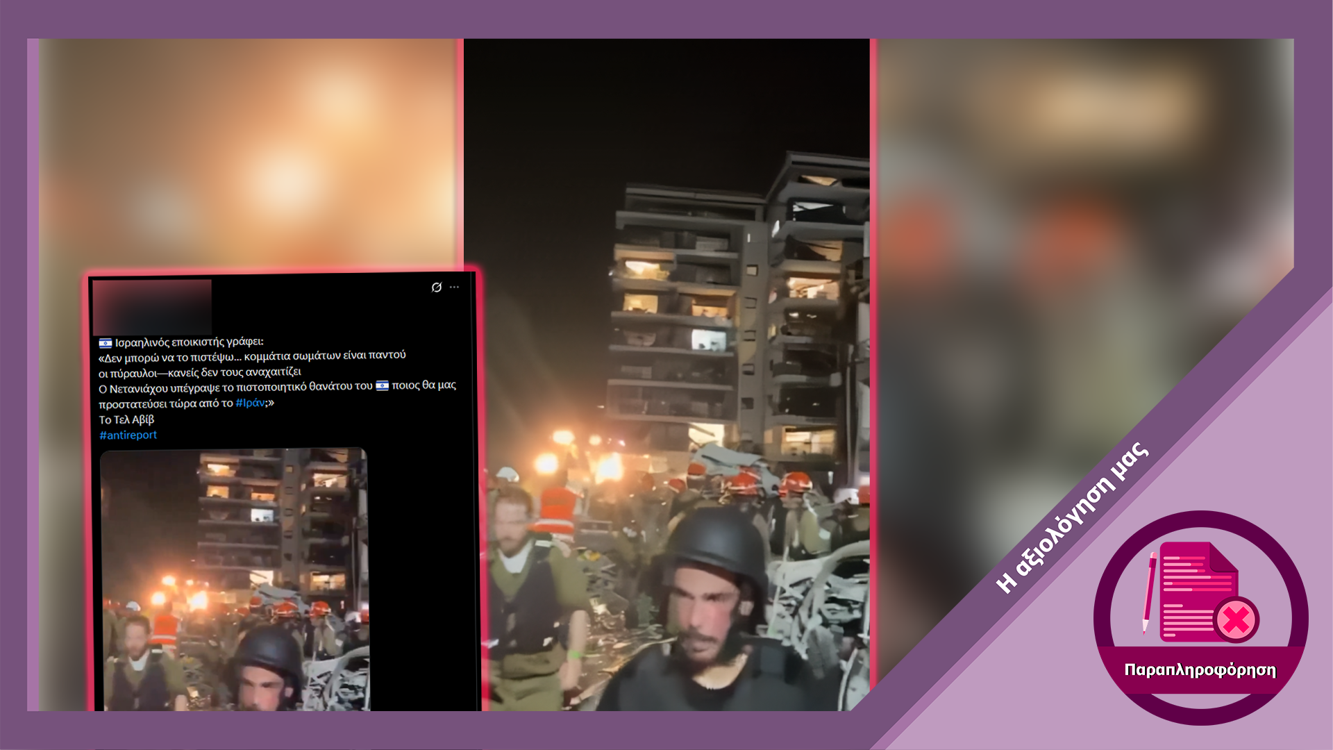 Κατά τον έλεγχο του βίντεο καρέ καρέ διαπιστώσαμε ότι είχε αναρτηθεί σε λογαριασμούς στο X και στο Facebook ήδη από τις 14 Ιουνίου 2025, κατά την περίοδο του λεγόμενου «Πολέμου των 12 ημερών» μεταξύ Ιράν και Ισραήλ, και δείχνει ιρανικά αντίποινα στις ισραηλινές επιθέσεις.