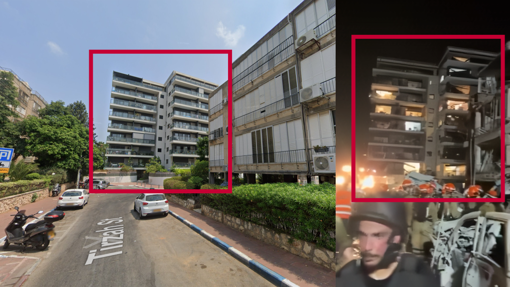 Επιπλέον, κατέστη δυνατό να προσδιοριστεί με αρκετά μεγάλη ακρίβεια και η τοποθεσία της επίθεσης, βάσει δημοσιευμάτων και χαρακτηριστικών κτιρίων της περιοχής. Συγκεκριμένα, δημοσιεύματα της ίδιας ημερομηνίας (εδώ και εδώ) κάνουν λόγο για επίθεση στην περιοχή Ραμάτ Γκαν, στο ευρύτερο Τελ Αβίβ. Χρησιμοποιώντας την υπηρεσία Google Street View, καταφέραμε να εντοπίσουμε το σημείο που καταγράφεται στο βίντεο.